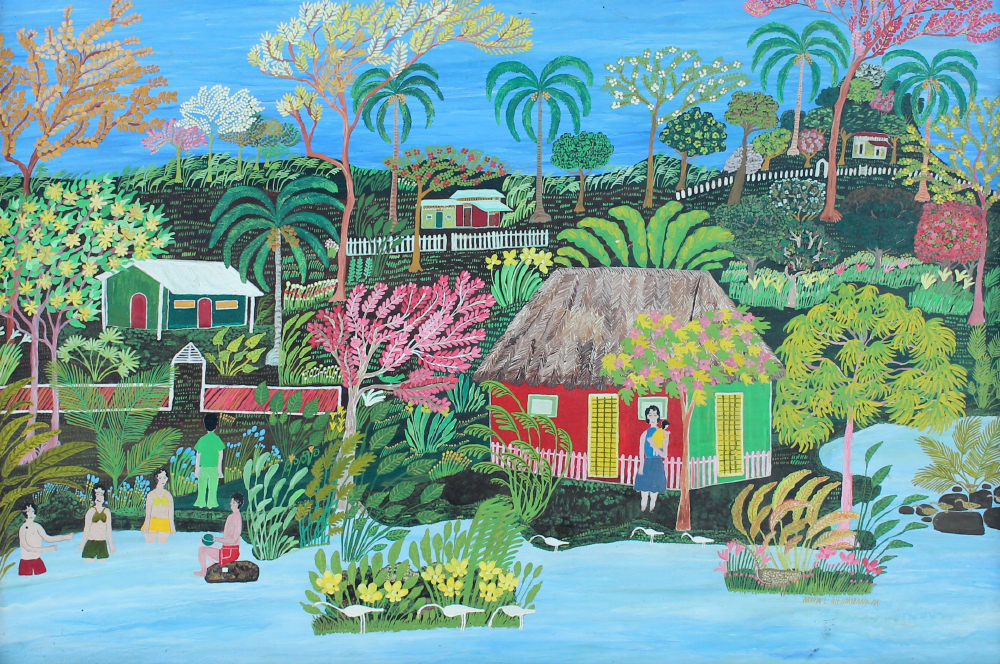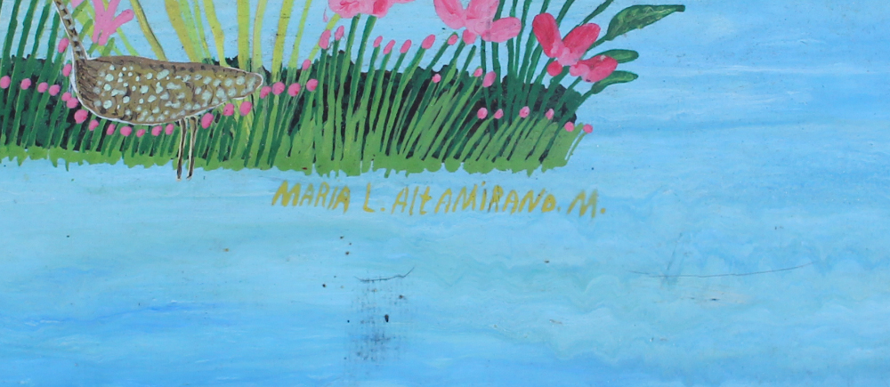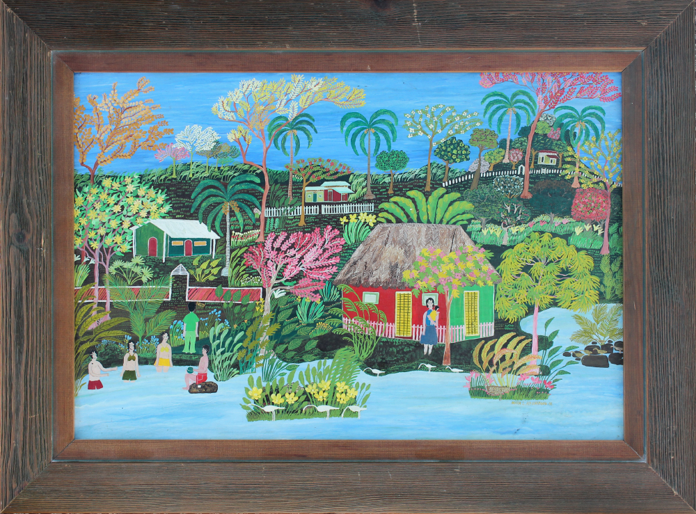 MARIA ALTAMIRANO FOLK PAINTING: Exceptional Folk Painting of Bathers in a Tropical Landscape, Oil/Canvas, 15'' x 22.13'', signed lower right, framed 20.5'' x 27.5''.