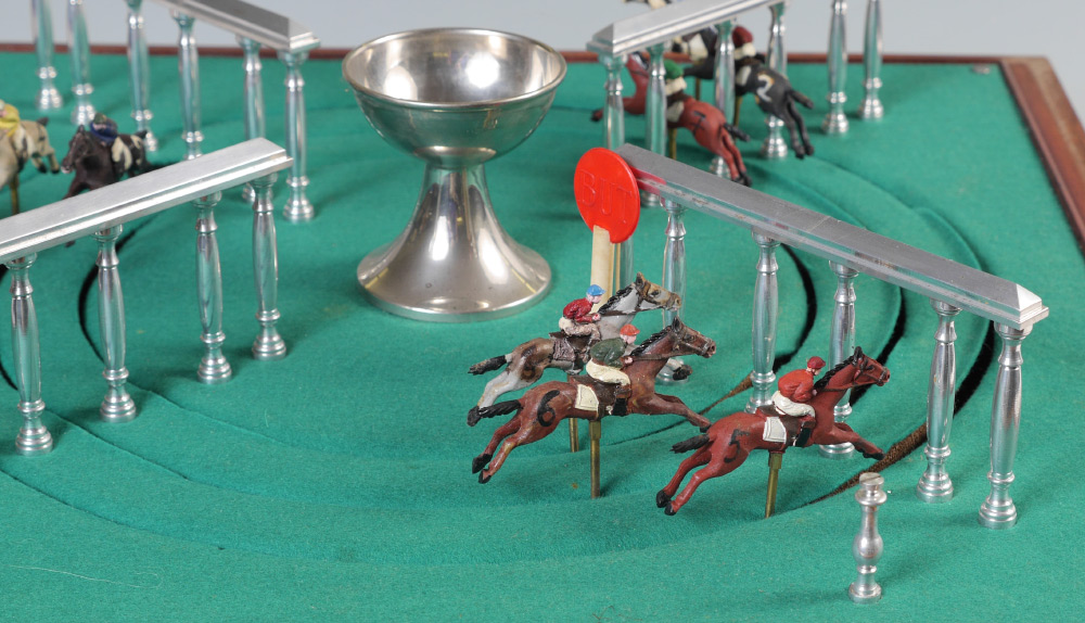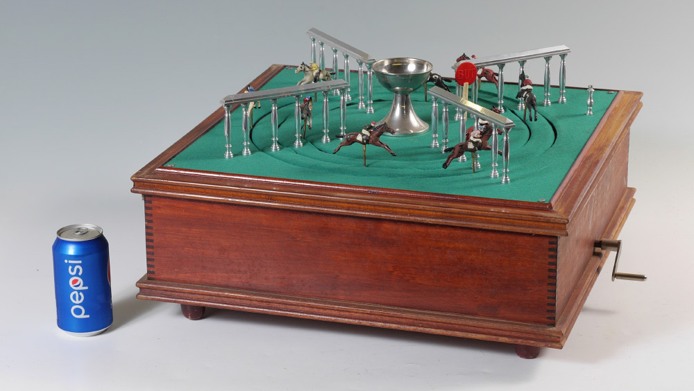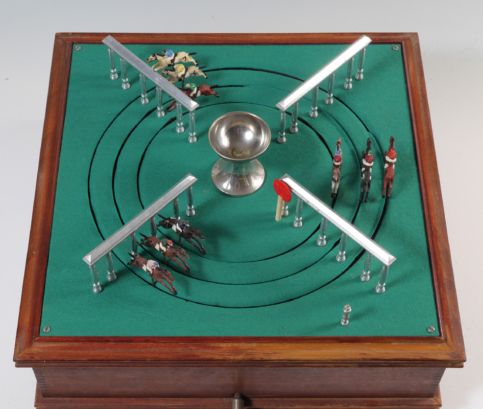 FRENCH MECHANICAL HORSE RACE GAME: Crank wind spins horses around felt top track, 9 composite horses on 3 tracks. In wood travel box, measures 11'' h. x 20'' x 20''.