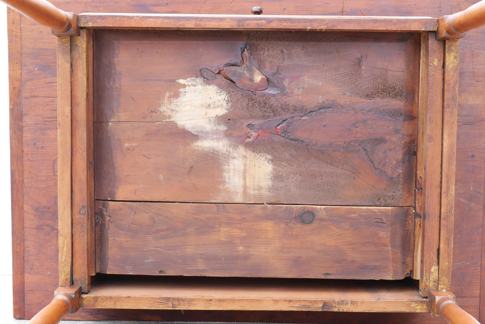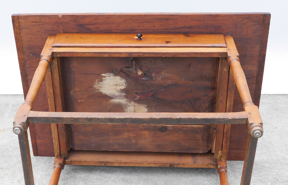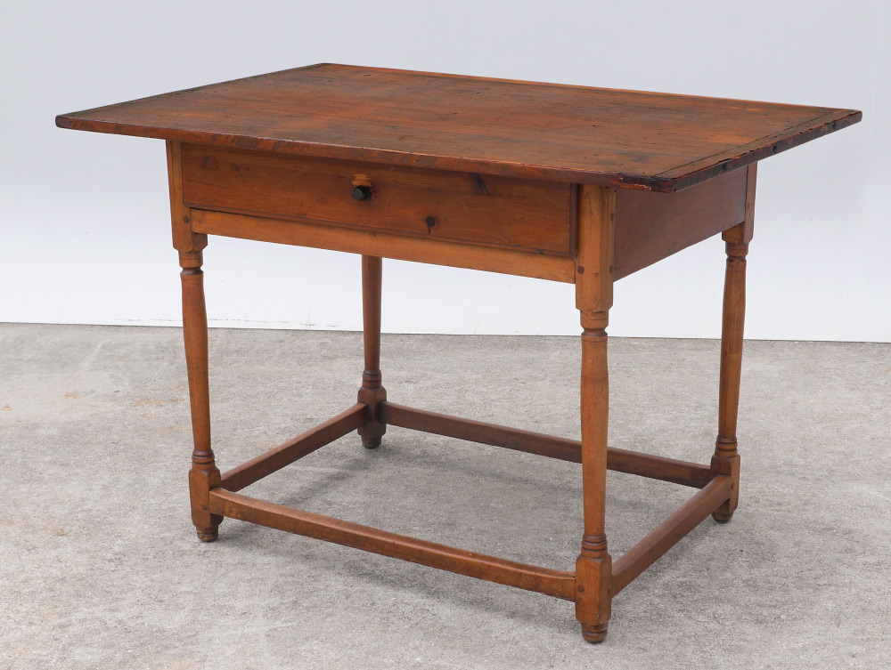 EARLY PINE TAVERN TABLE: 3 board top with breadboard ends, pegged construction. Single drawer with canted baseboard, turned legs, lower stretchers. Overall measures 26 3/4'' h. x 39 1/4'' x 27''.