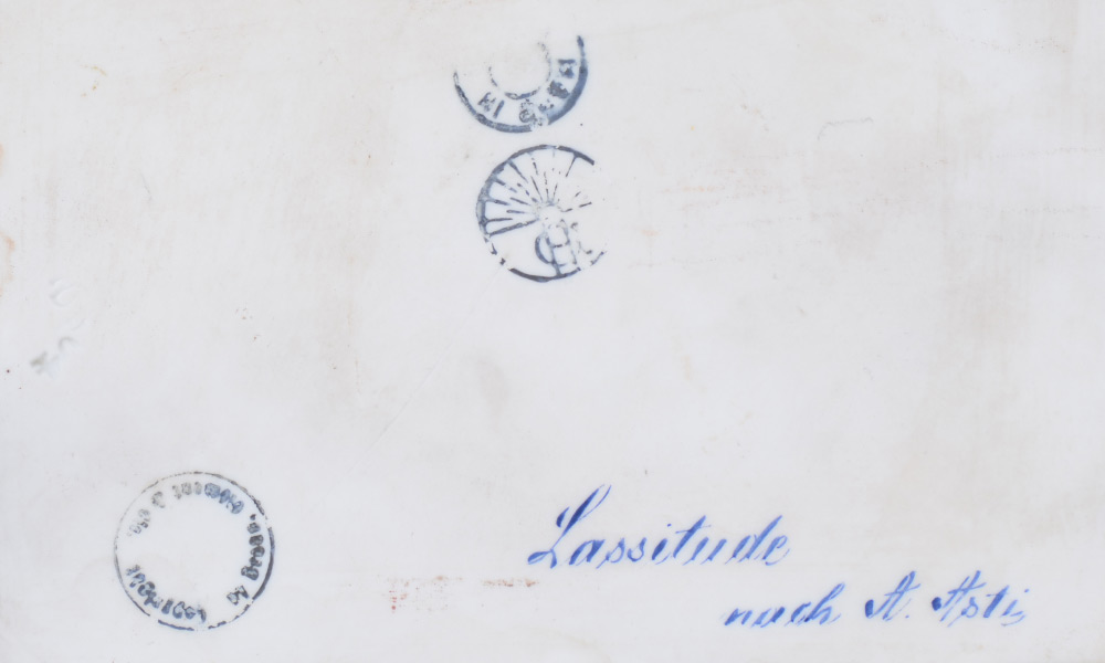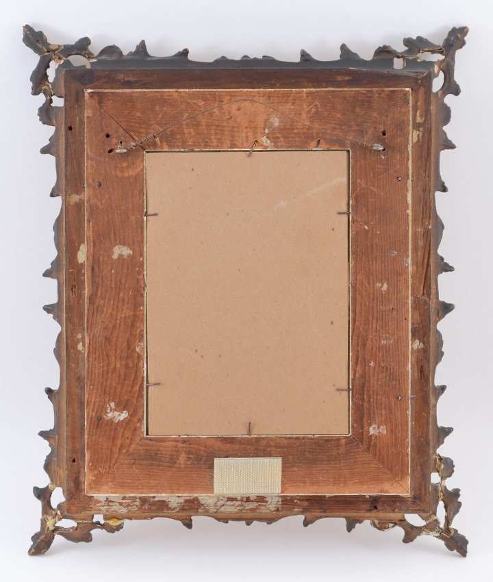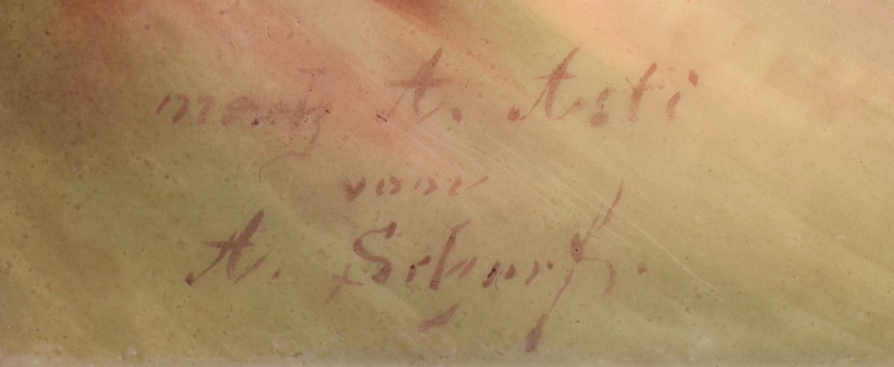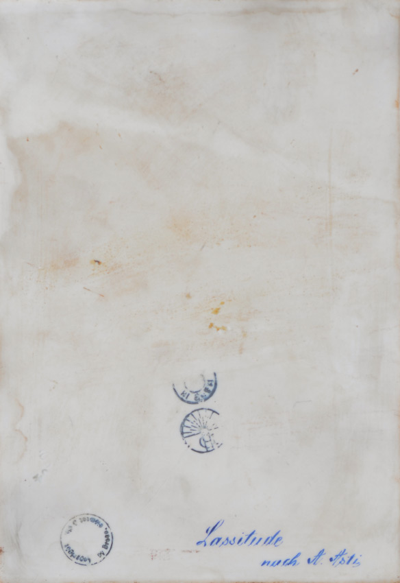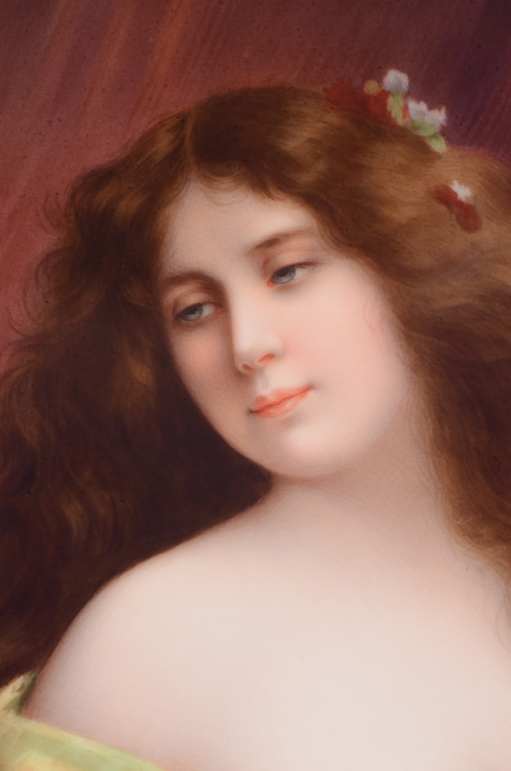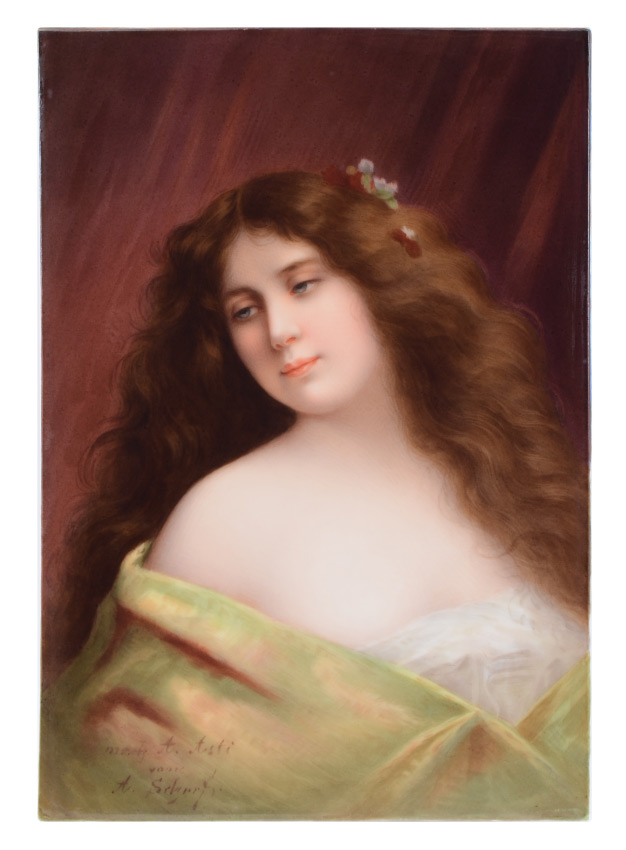 HEUBACH PORCELAIN PAINTED PLAQUE: ''Lassitude'' by A Scherf after Angelo Asti, signed lower left, plaque 7.75'' x 5.5'', elaborately carved gilt frame, overall 15'' x 12.5''.