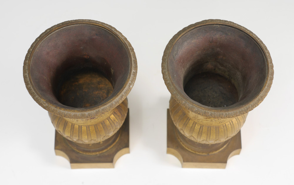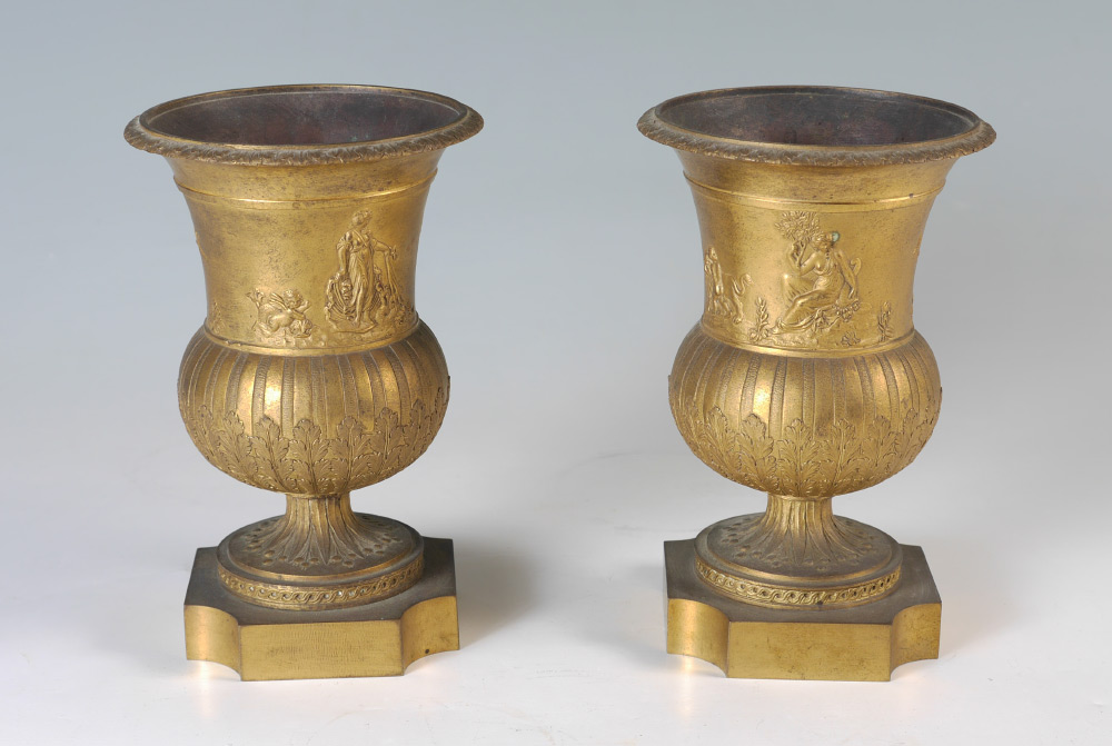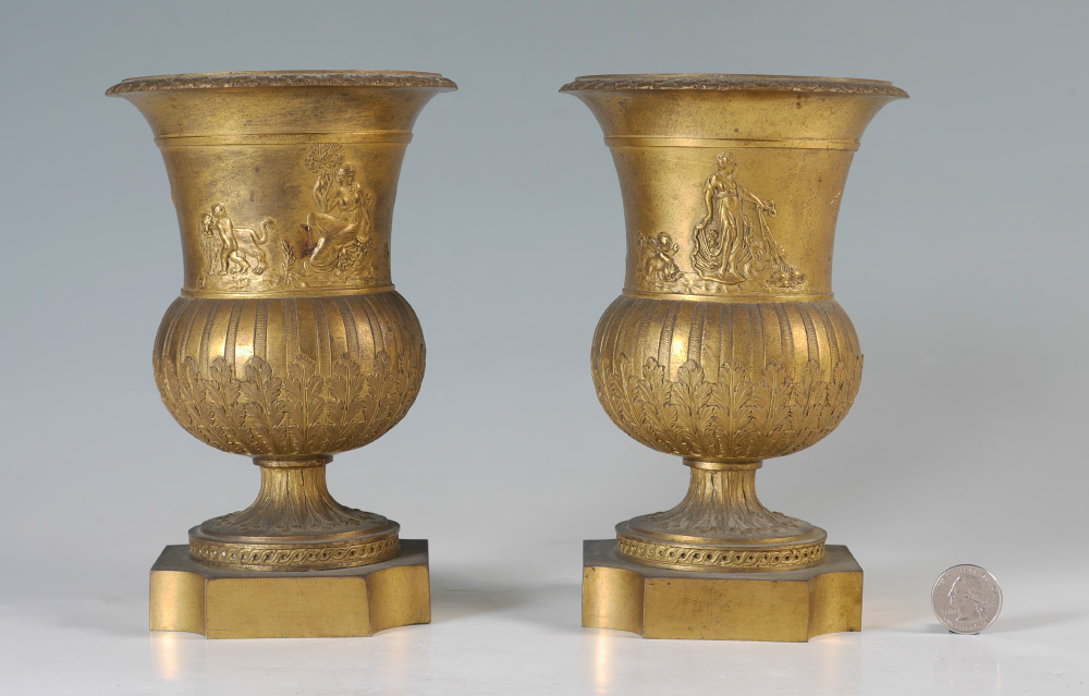 PAIR 19TH CENTURY PARCEL GILT URNS: Low relief neoclassical scene with Venus on her chariot and dolphins, scene of child with lion and seated maiden, and insects. Shaped base, overall measure 7 1/2'' h. x 5'' dia.