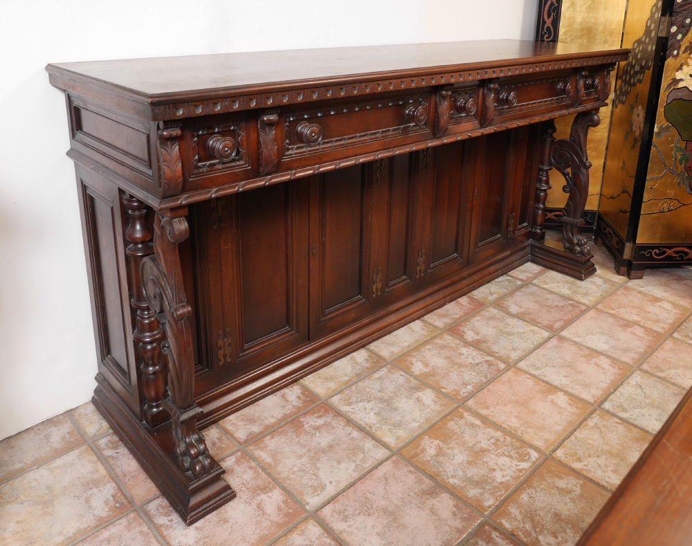 CENTURY FURNITURE CARVED SIDEBOARD: Gothic revival style cabinet with carved foliate scroll and paw feet supports to front, 5 drawers over 4 doors, 39 1/4'' h. x 84 1/4'' x 24''.