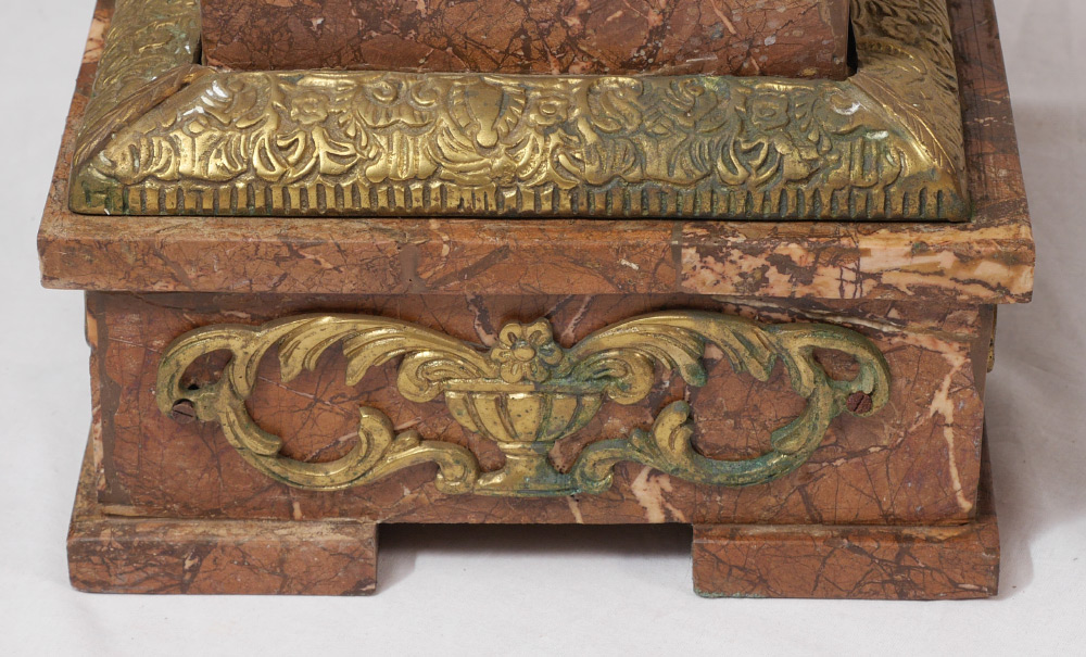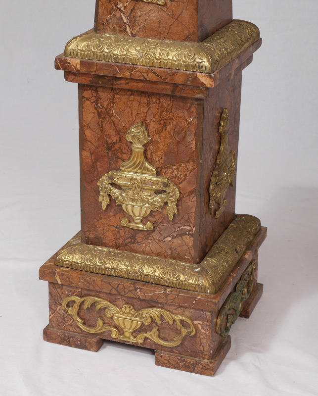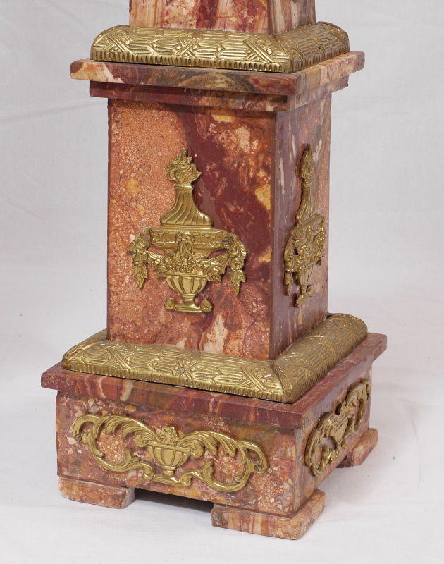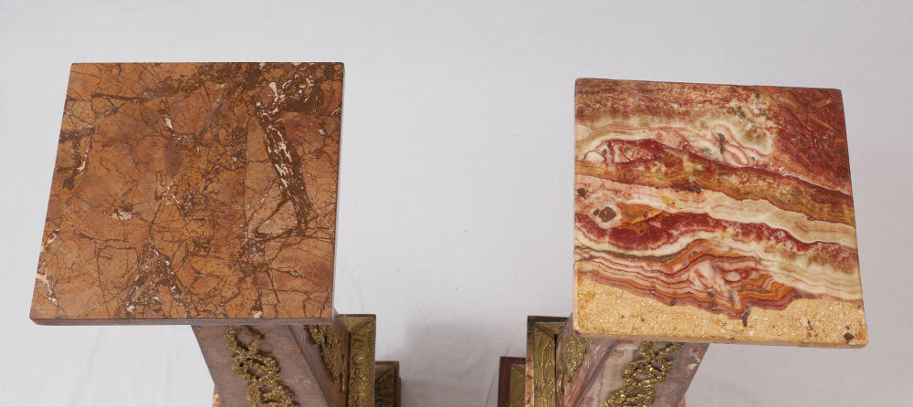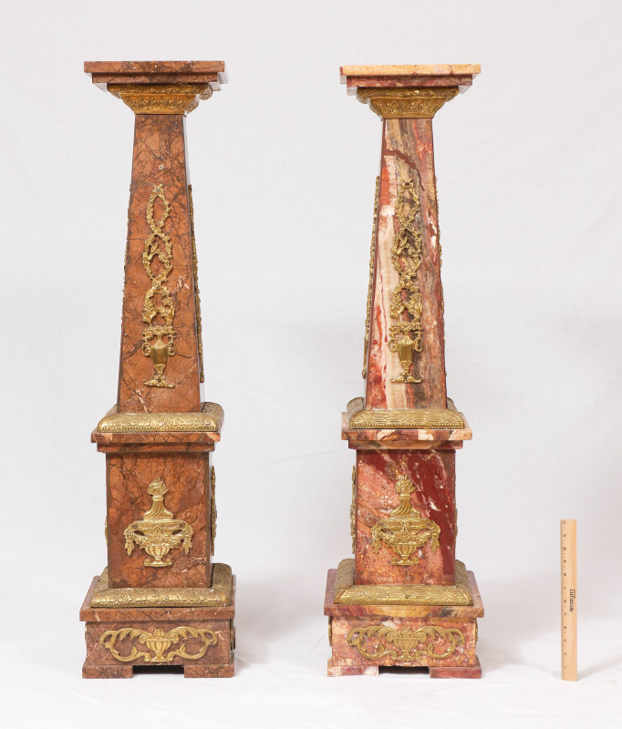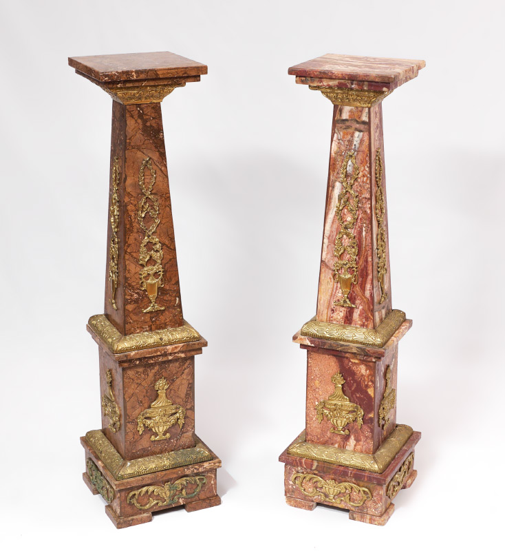 PAIR MARBLE AND GOLD GILT METAL PEDESTALS: 2 tapered column pedestals with variances to marble from each other. Each with gold gilt metal applied decoration, urn and floral garland motifs, on 4 feet. Each measures 47'' h. x 10 1/2'' square tops, 12 1/4'' base.