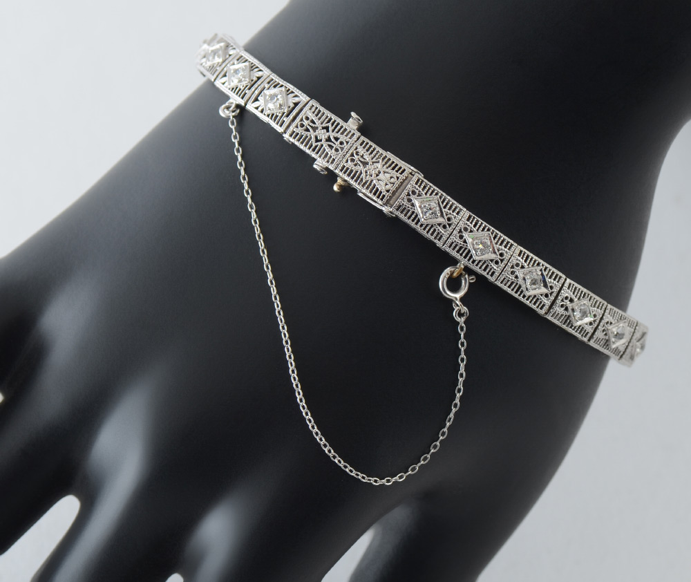 ELEGANT WHITE GOLD BRACELET WITH 20 DIAMONDS: 10K White Gold rectangular filigree links form this bracelet. 20 of the 22 links feature an old mine cut / old European cut diamond at approx. .07 Cts each. 8.5'' length, total diamond weight approx 1.5 Ct., color: I-J, clarity VS-2 to I-1.