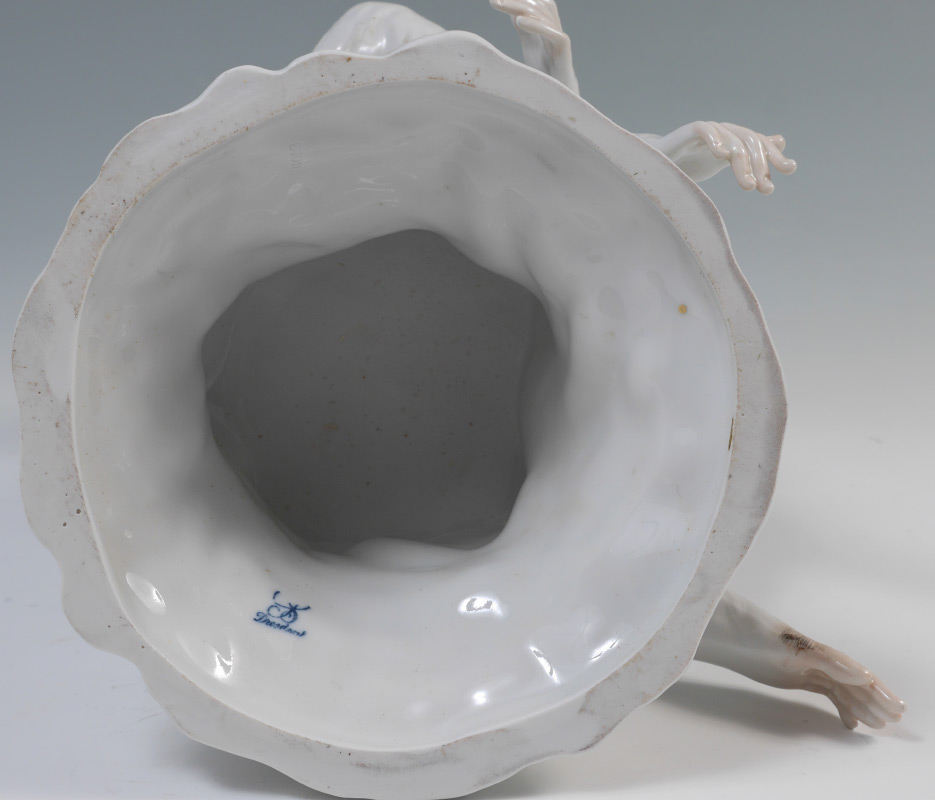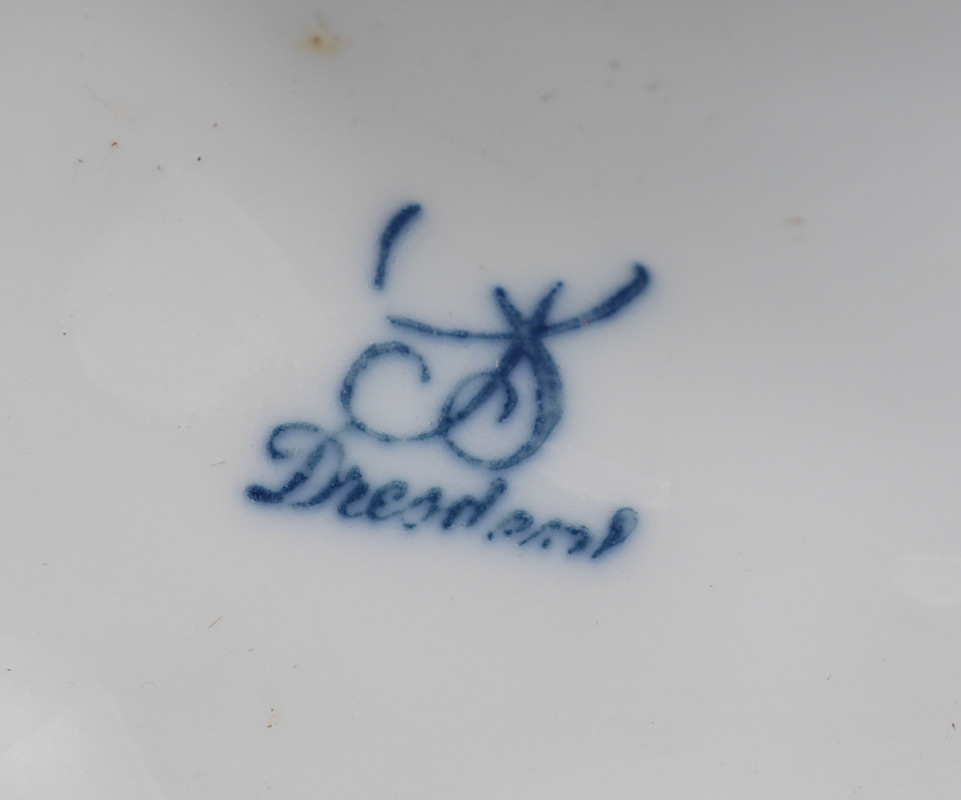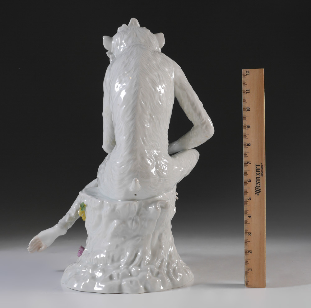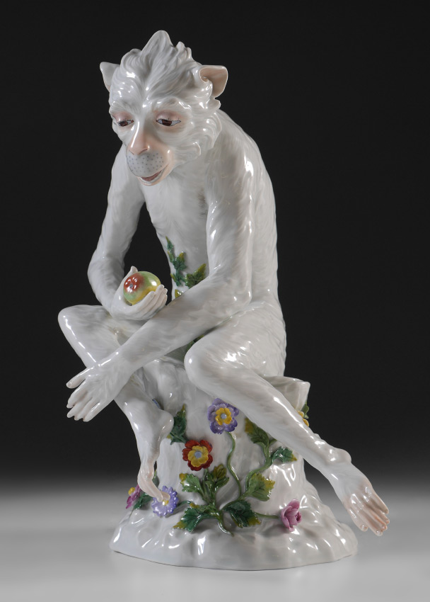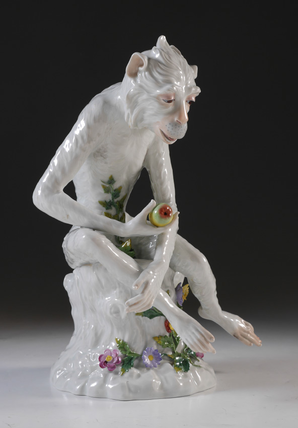 LARGE DRESDEN PORCELAIN MONKEY FIGURE: Figure of a seated monkey holding an apple with applied floral decoration. Blue Dresden marks inside, overall measures 16'' h. x 10 1/2'' x 9 1/4''.