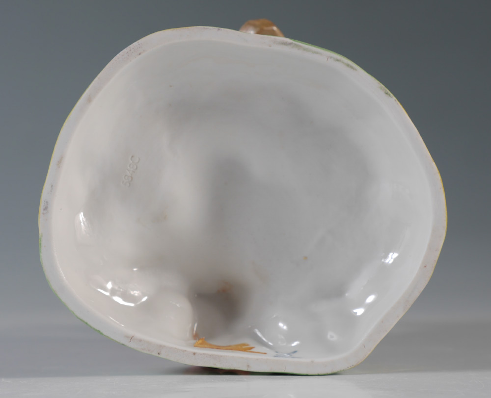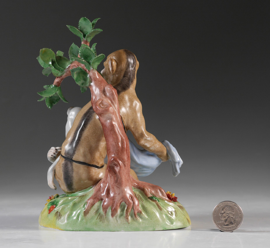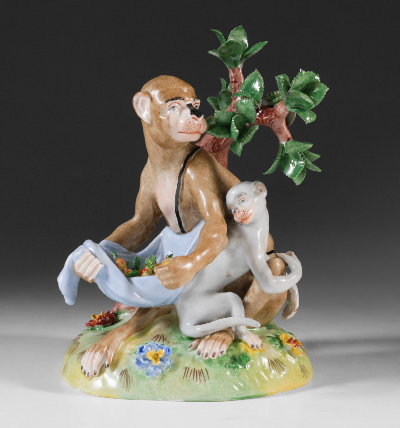 DRESDEN PORCELAIN MONKEY FRUIT GATHERER FIGURINE: Figural group of 2 monkeys, one gathering fruit in a cloth, and a tree. Marked on base with blue Carl Thieme Dresden mark. Overall measures 6 3/4'' h. x 4 3/4'' x 5''.