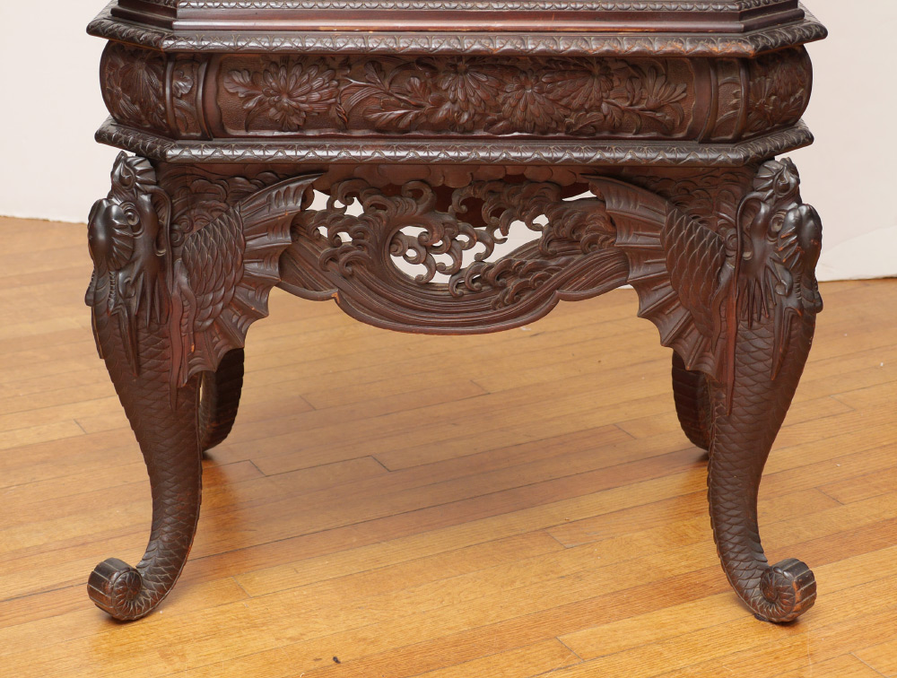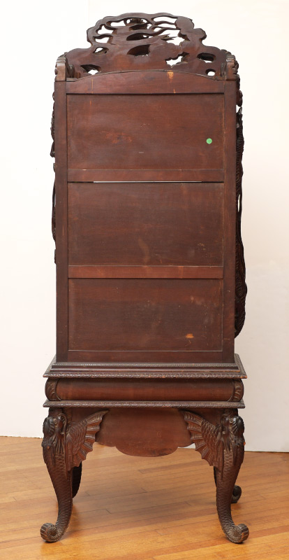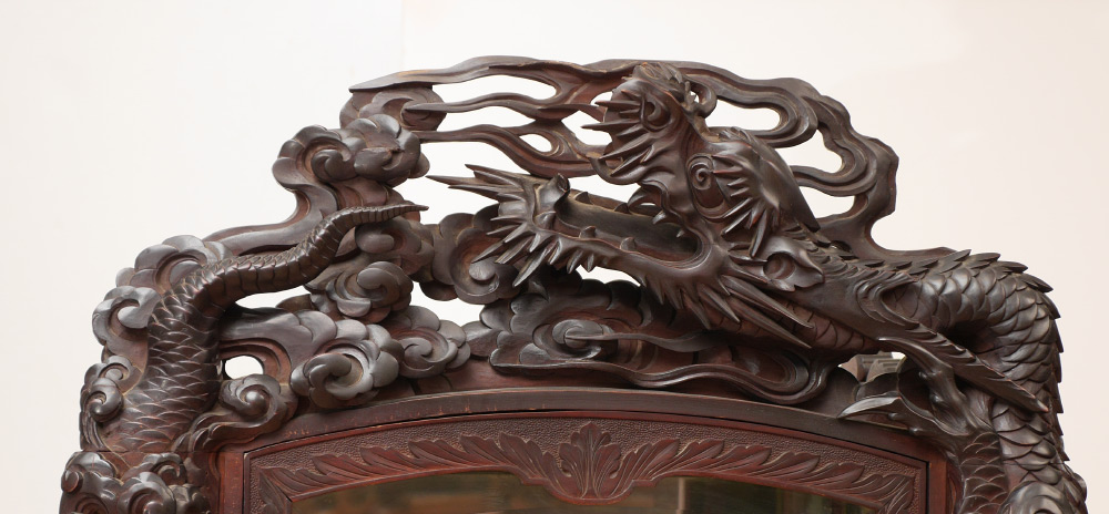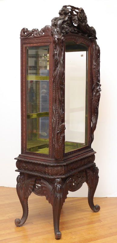 ORIENTAL CARVED DRAGON VITRINE / DISPLAY CABINET: Glass door encircled with openwork carved full figure dragons in clouds decoration, glass sides, mirrored back, openwork wave skirt, winged dragon legs. Overall measures 77'' h. x 31'' x 19''.