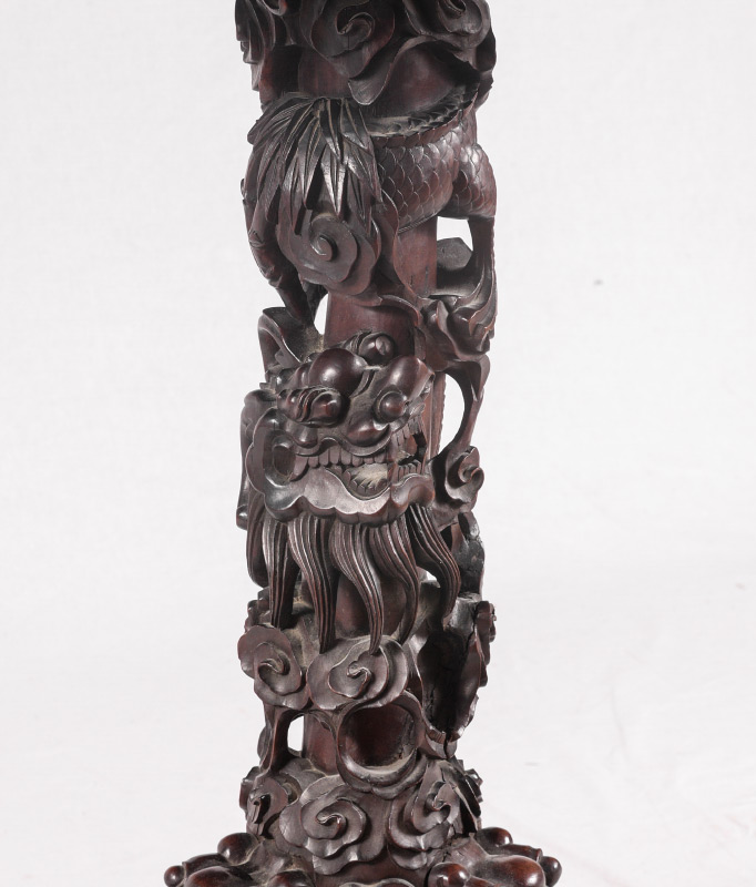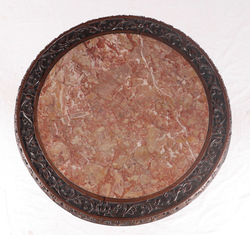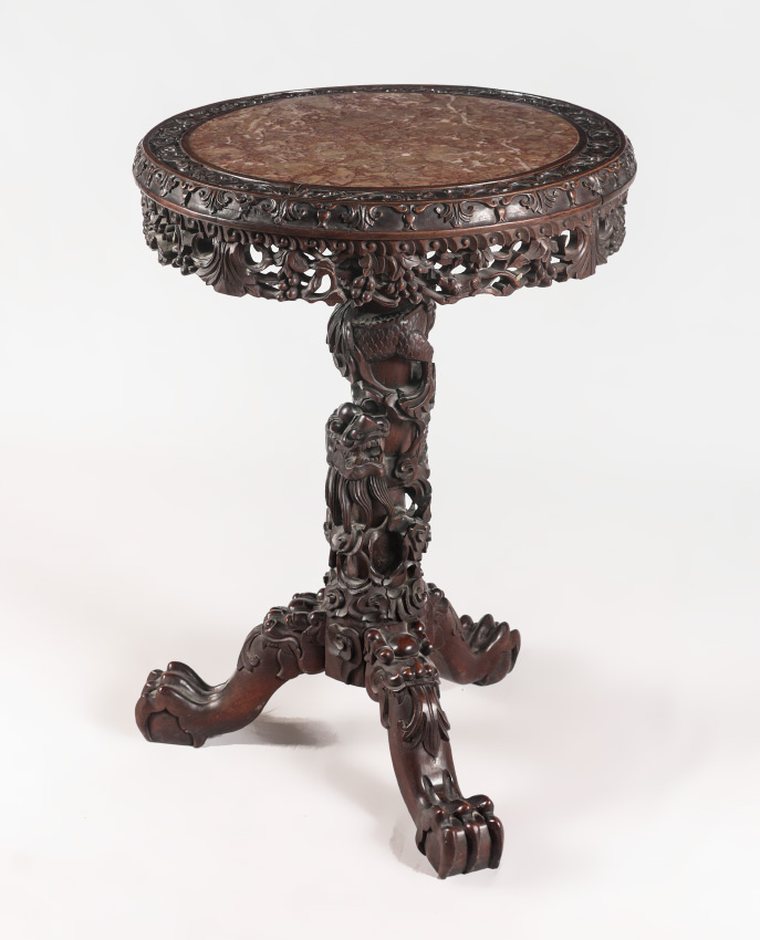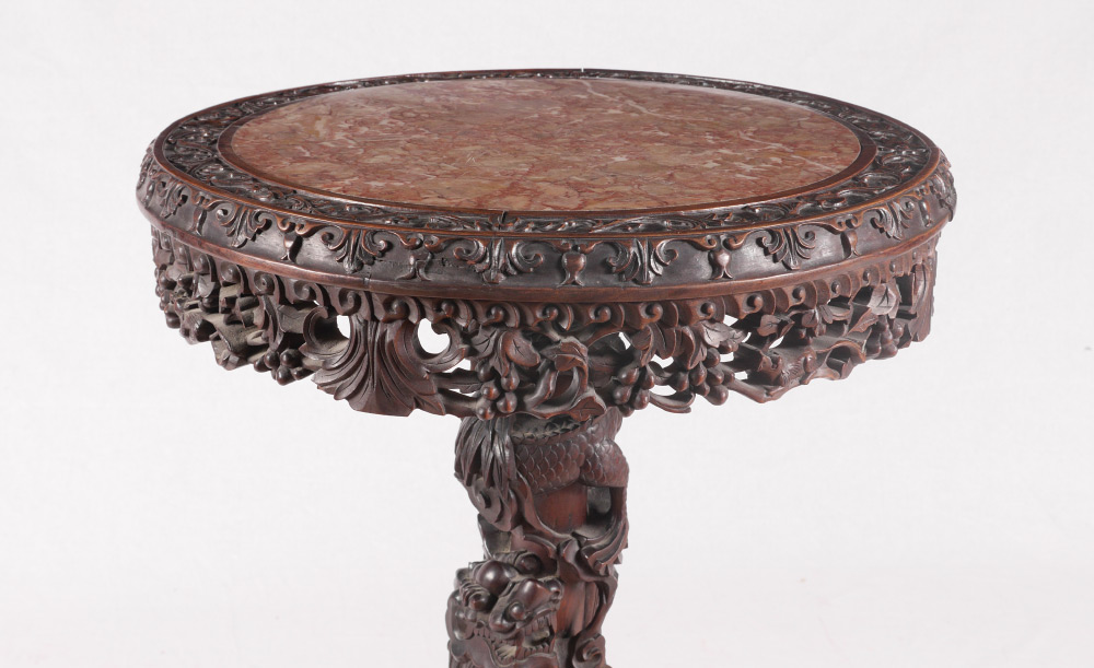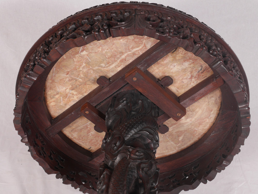 ORIENTAL CARVED FIGURAL DRAGON MARBLE TOP STAND: Inset marble top with carved foliate trim, pierced carved foliate skirt, pedestal base with figural dragon, 3 splayed paw feet. 31 1/2'' h. x 22''.