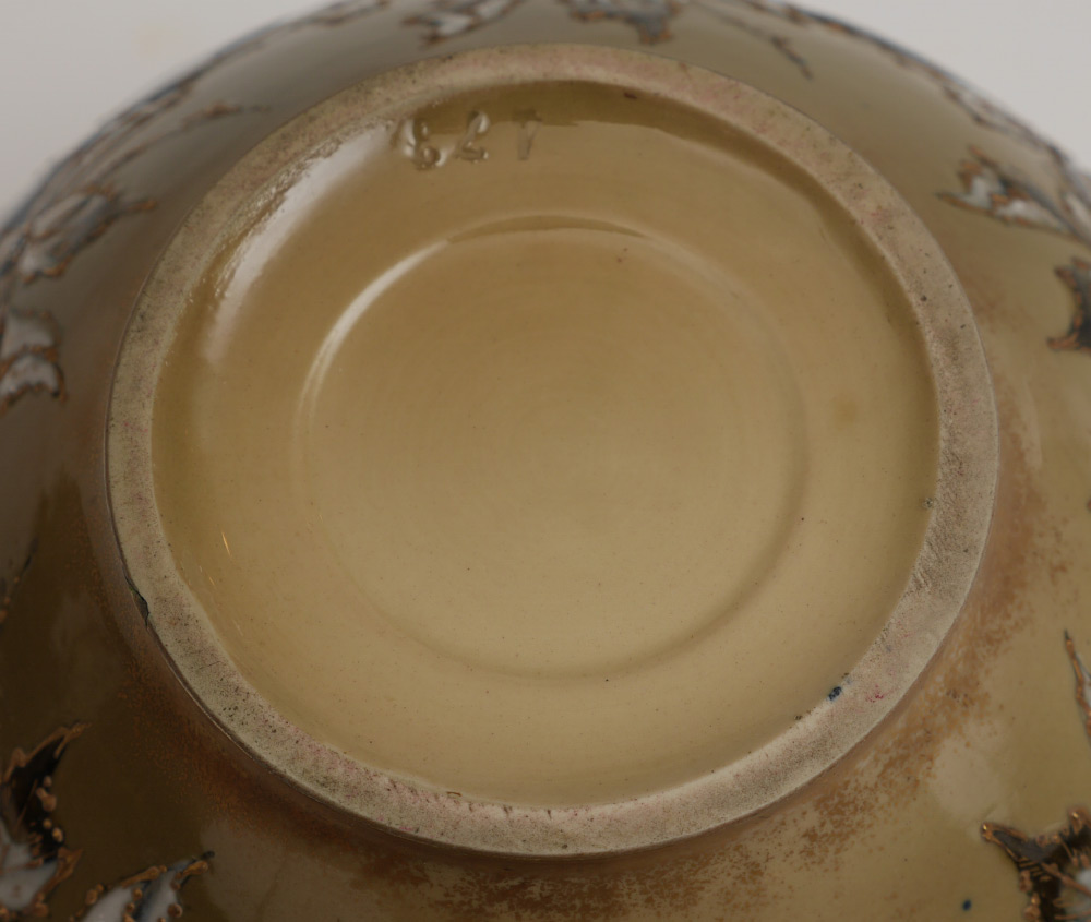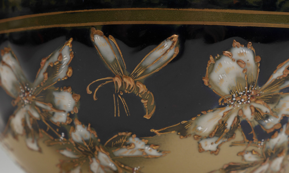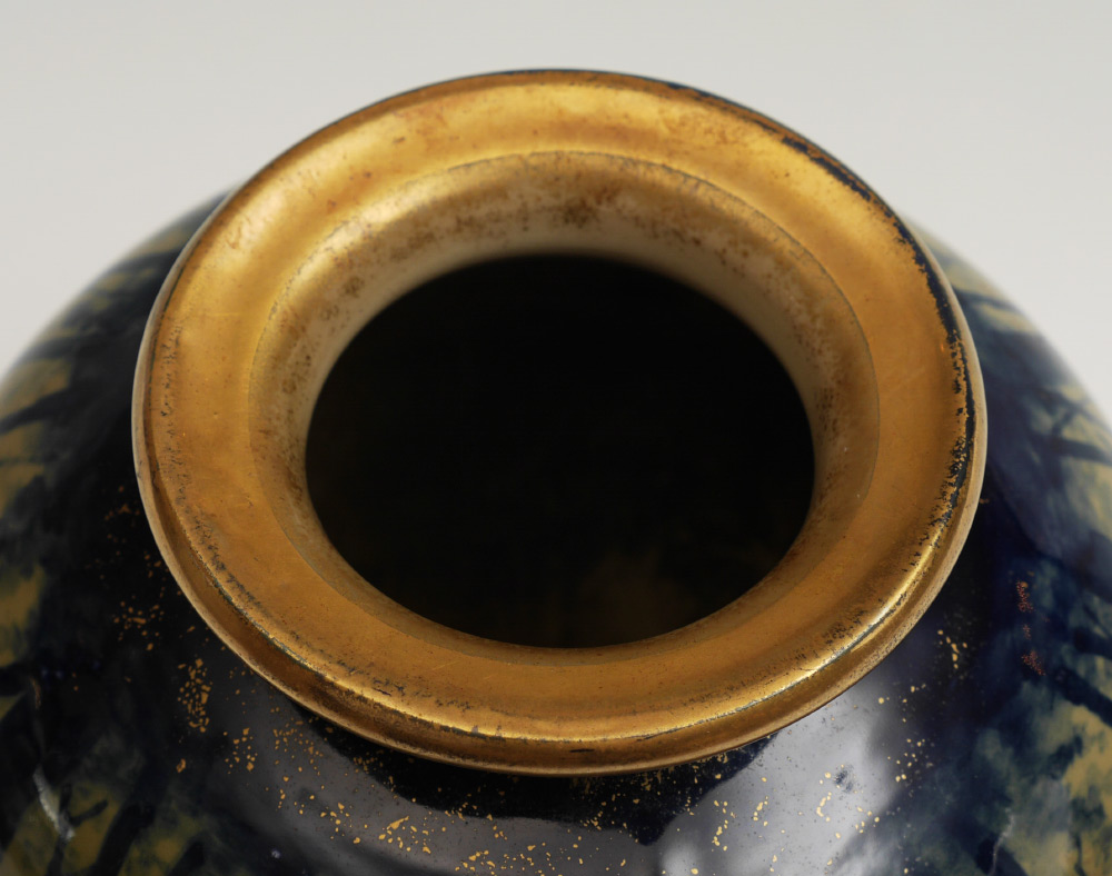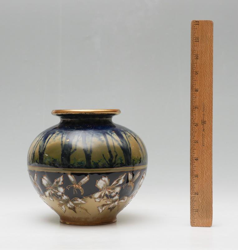 TURN-TEPLITZ AMPHORA FOREST SUNRISE VASE: Top half of body with forest sunrise scene, lower half with enameled and gilt decorated flowers and wasps. Impressed 473 on base, similar examples marked with Riessner, Stellmacher & Kessel marks, this example does not have those markings. Overall measures 7'' h. x 7'' dia.