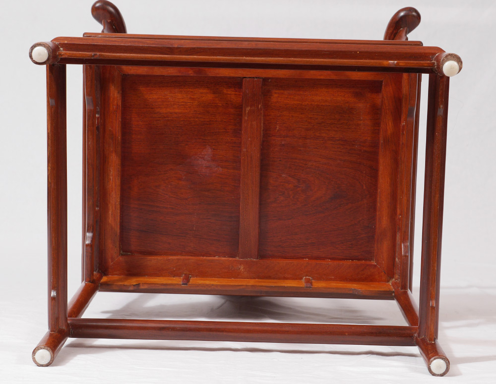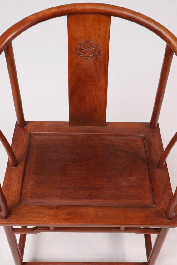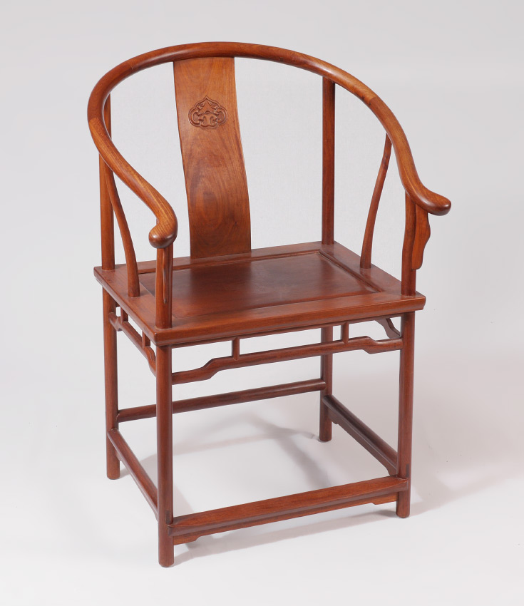 CHINESE HORSEBACK ARM CHAIR: Bent wood back and arm rests, shaped back splat with carved medallion. Chamfered board seat, shaped skirt and stretchers, overall measures 39'' h. x 26 1/4'' x 23''.
