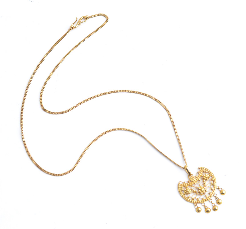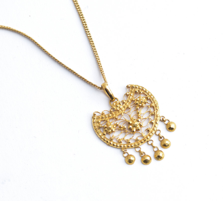 22 K GOLD CUBAN LINK NECKLACE AND BEAD CUT PENDANT WITH BEAD DROPS: Semi-circular filigree pendant with bead cut floral petal design and bead drops all suspended on a 20'' long Cuban style link chain with S hook. Total weight 14.7 grams.
