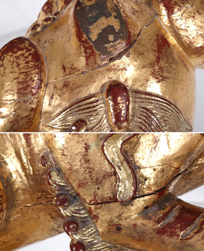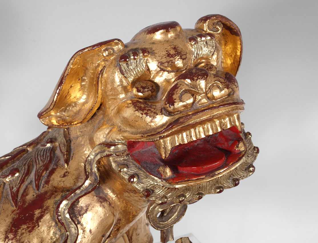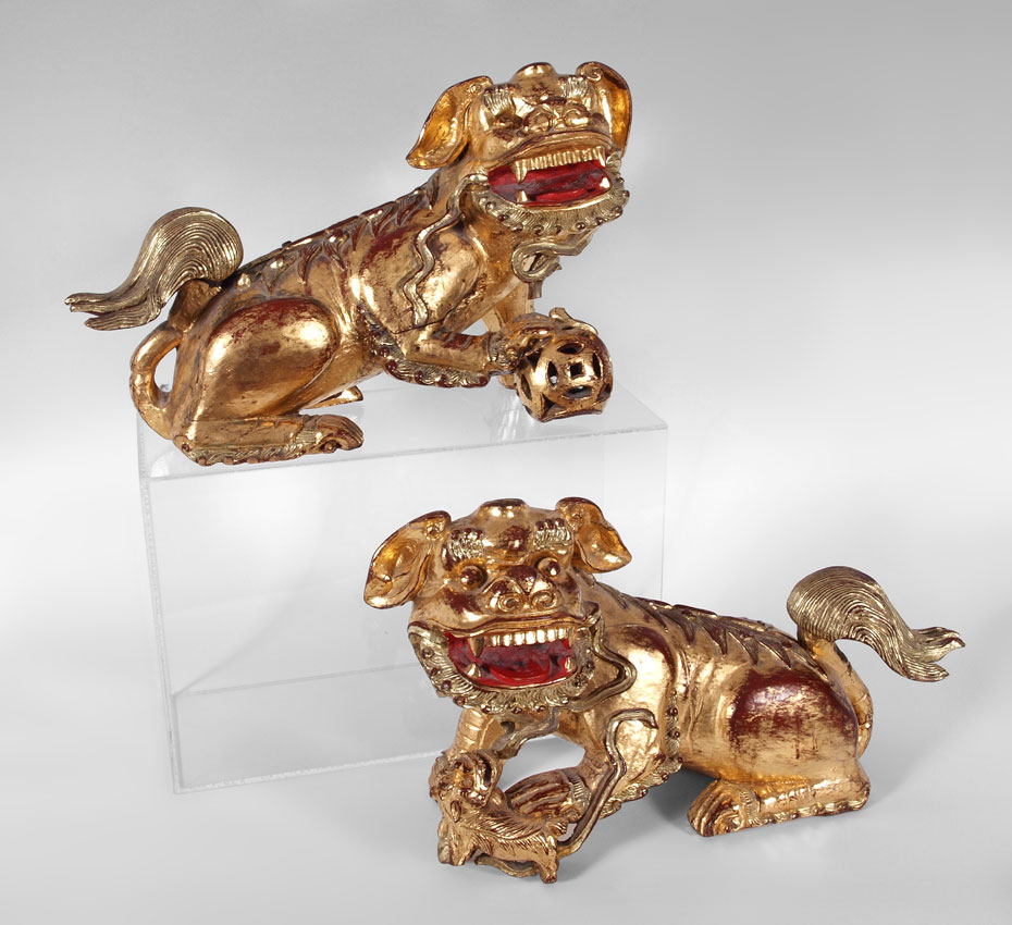 CONDITION: Note male dog has repairs to 2 feet and front leg. Female has age crack to head, missing 2 sections of tail. Loss of gilt to both.