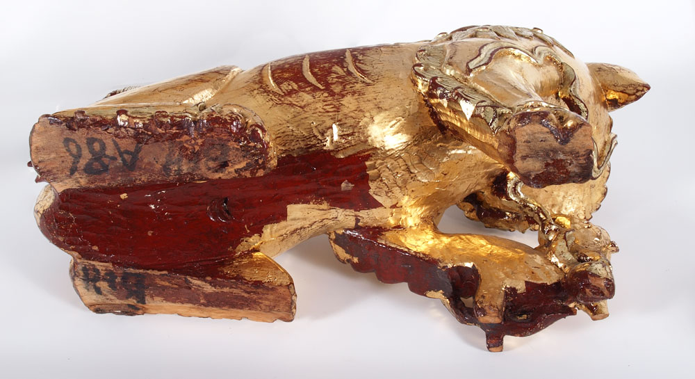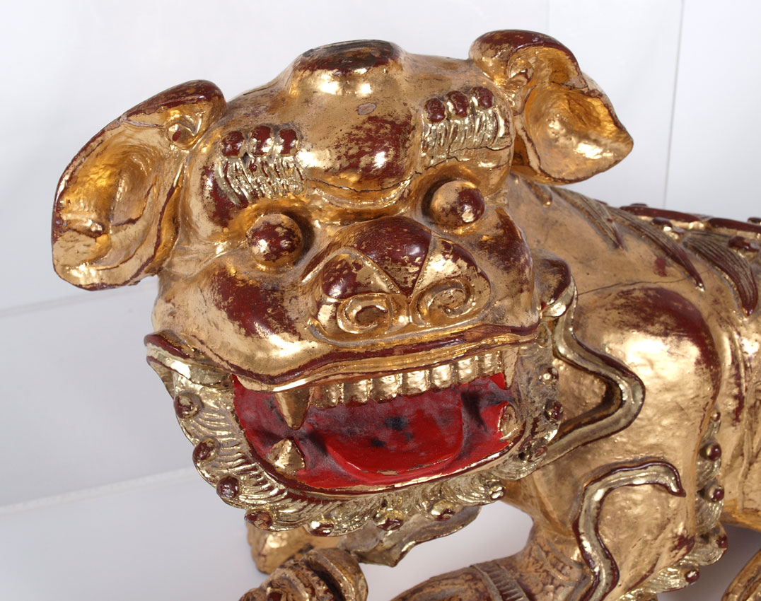 PAIR CARVED WOOD GOLD GILT TEMPLE DOGS: Red lacquer and gold gilt pair. Larger of pair measures 12 1/4''h. x 19'' x 7 1/2''. Age unknown.