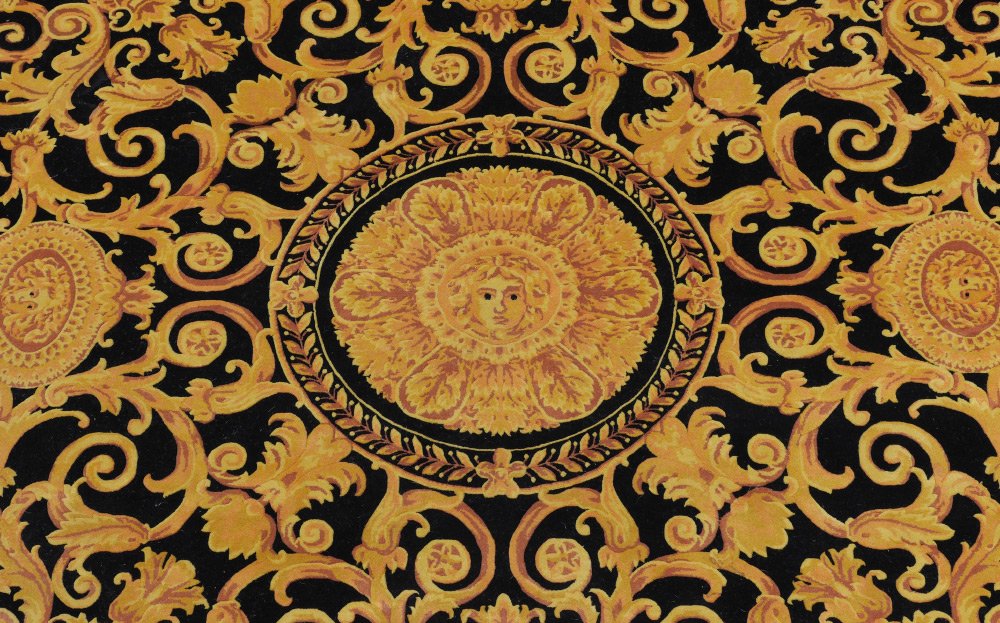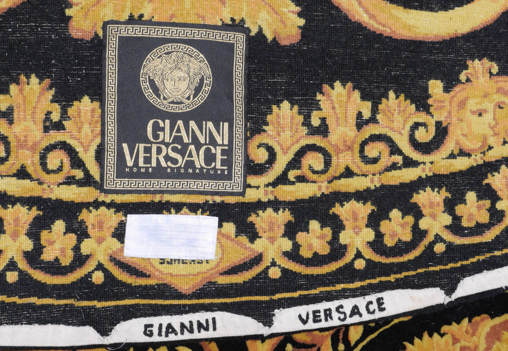 ATELIER VERSACE CARPET, 10' diameter: Authentic Versace hand knotted creation. Black ground with gold swirl acanthus leaf pattern centered by large medallion with Medusa head, smaller directional medallions each with their own head. Several guard borders with the inner line having spaced heads, next being swags and flowers with the Versace rhombus and the outer being a single solid line of gold. Gianni Versace stitched to back edge, Gianni Versace Home Signature label verso.