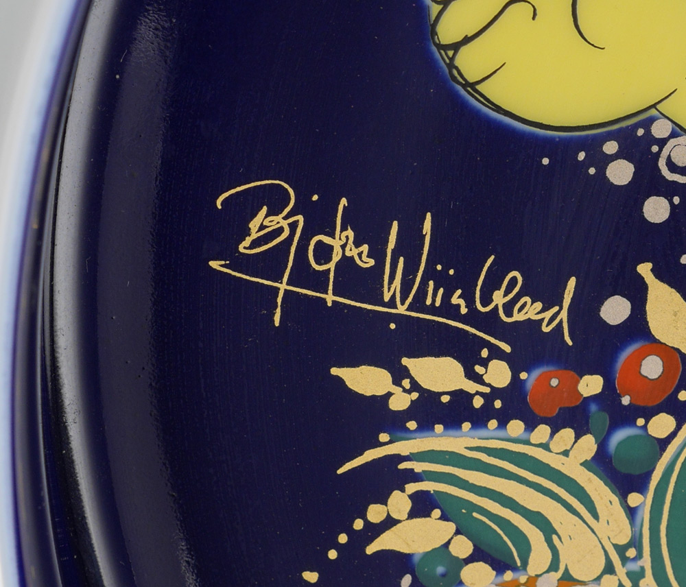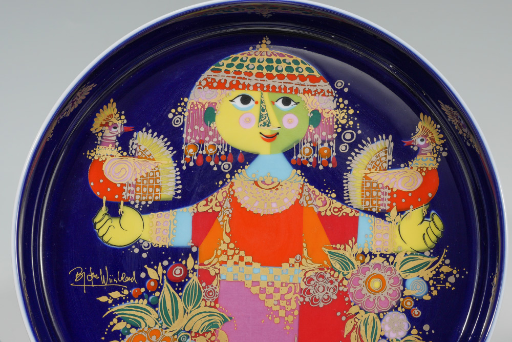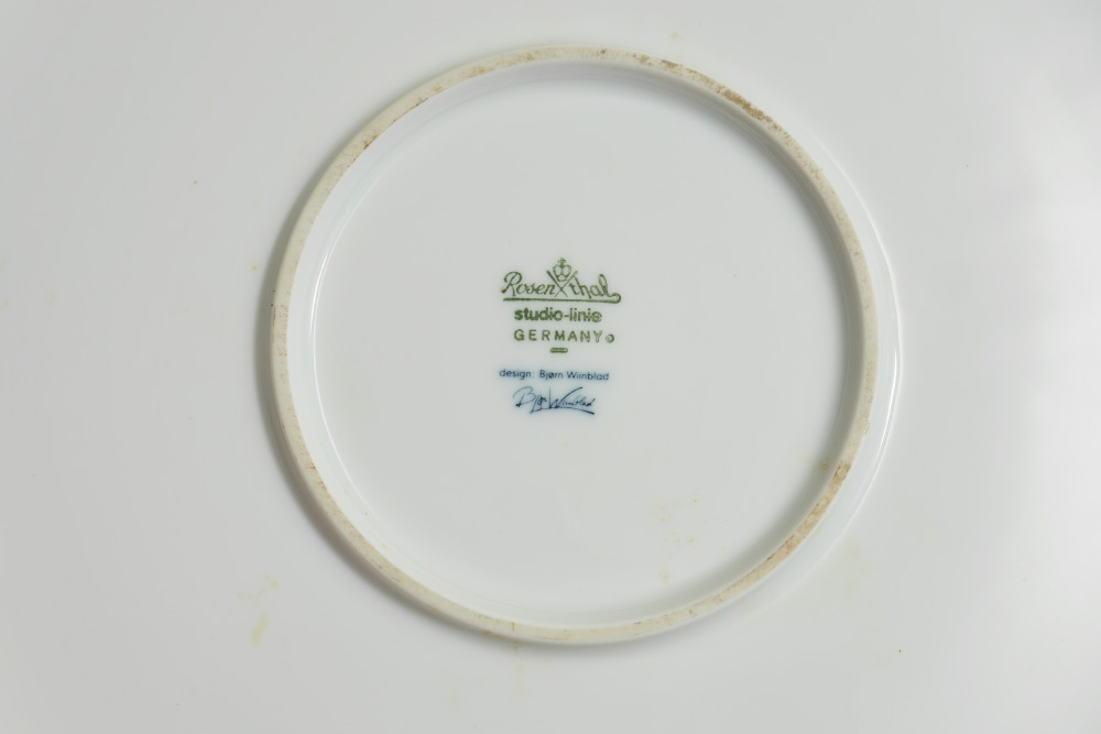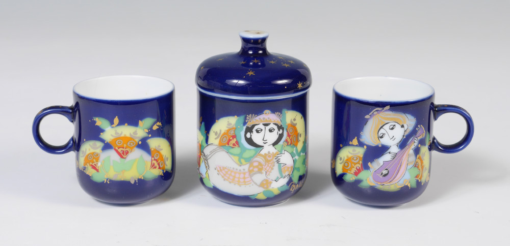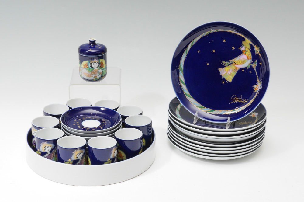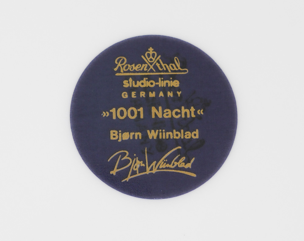 ROSENTHAL STUDIO 1001 NIGHTS TEA SET: Design by Bjorn Wiinblad, 10 cake plates (7 3/4''), 10 tea cups, 8 saucers, 1 covered sugar (3 1/2'' h.) & 1 deep dish (10'' dia.). Most pieces marked with Green Rosenthal mark, studio-linie, German and Wiinblad mark. Saucers' marks are topped with Blue and Gold 1001 Nacht mark.