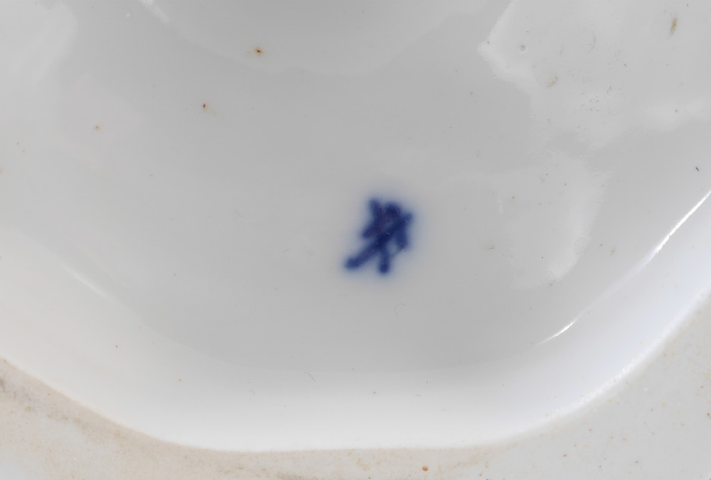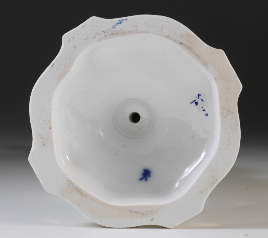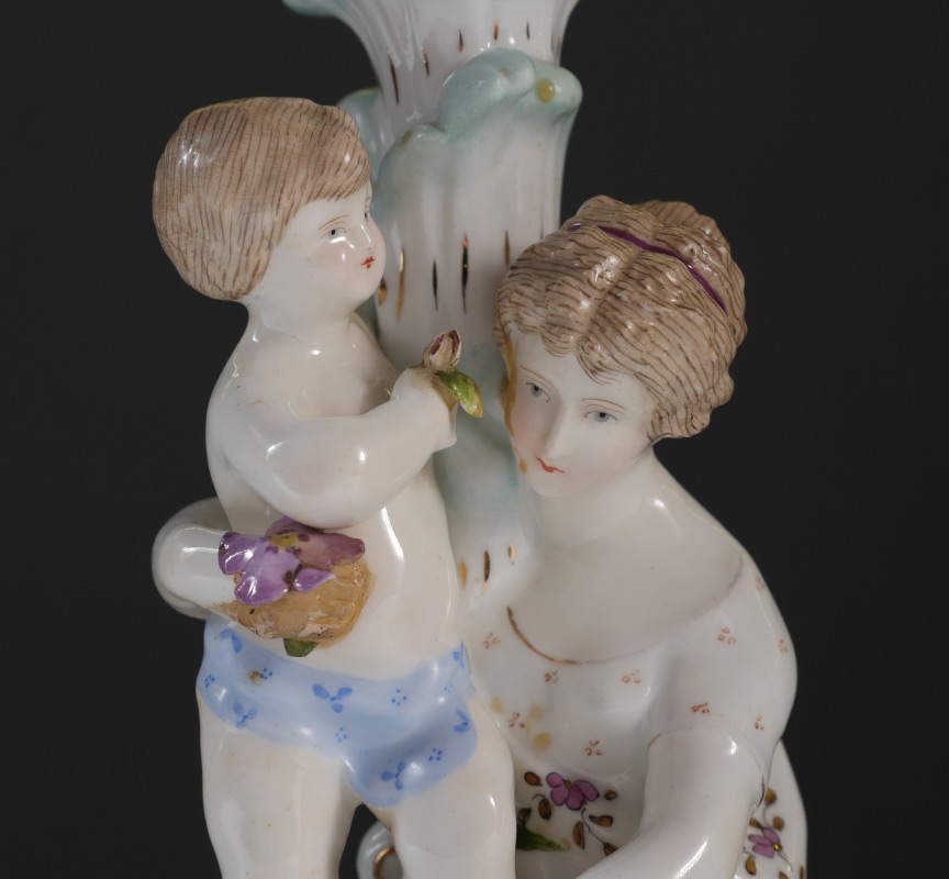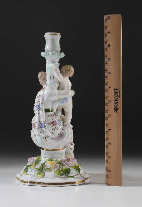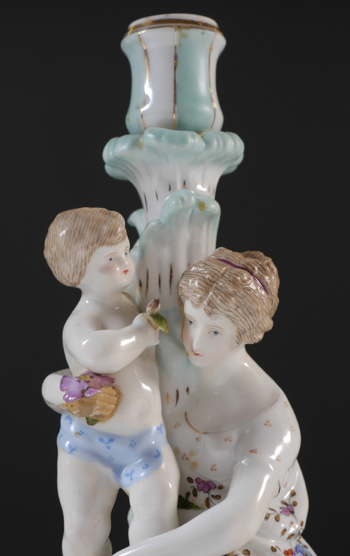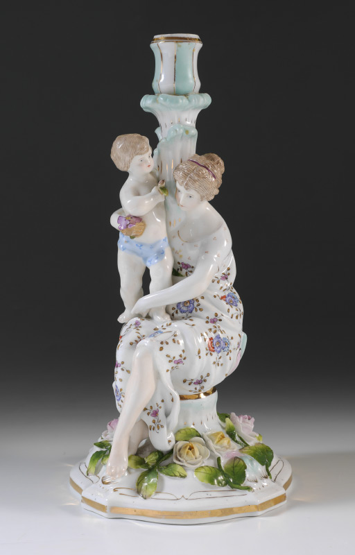 MEISSEN FIGURAL CANDLE HOLDER: Figural group of seated woman with child, applied flowers, blue crossed sword mark on base. Overall measures 11'' h. x 5 1/4''.