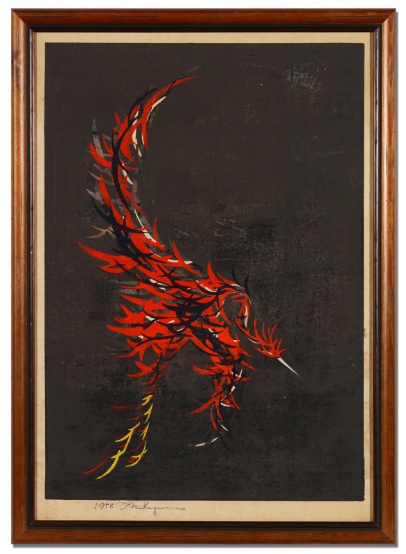 NAKAYAMA, Tadashi, (Japanese, 1927- ): ''Incarnation Raku'', Woodblock Print, Sight size 32'' x 22 1/4'', pencil signed lower left, dated 1958, custom frame 35'' x 26''.