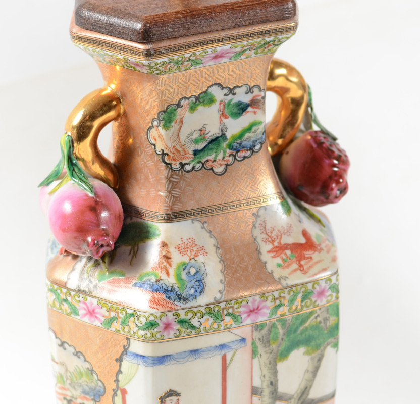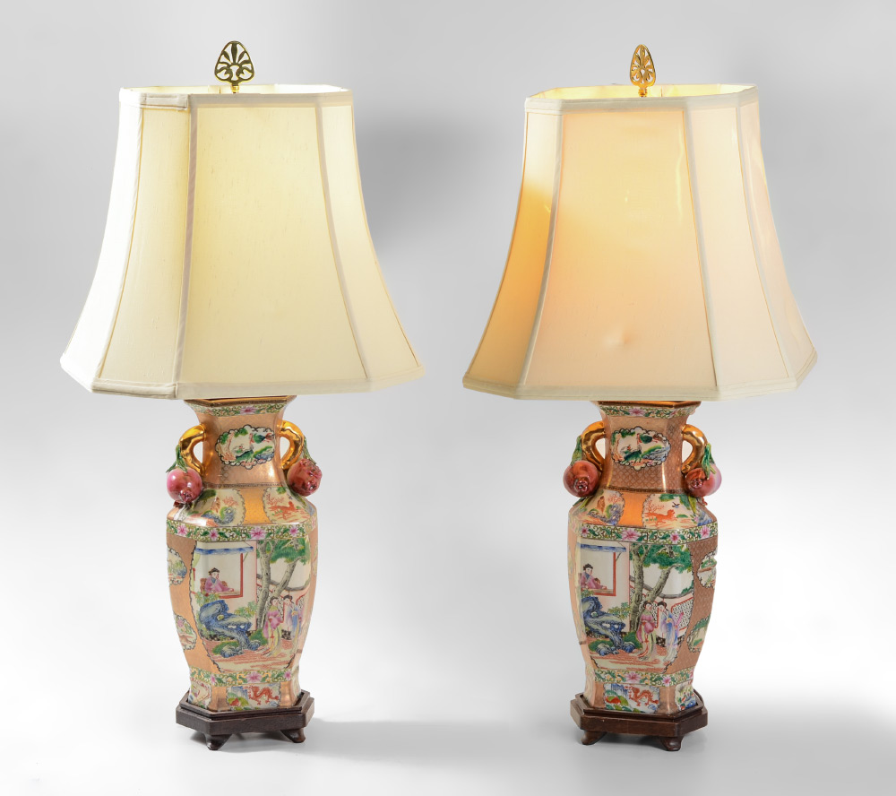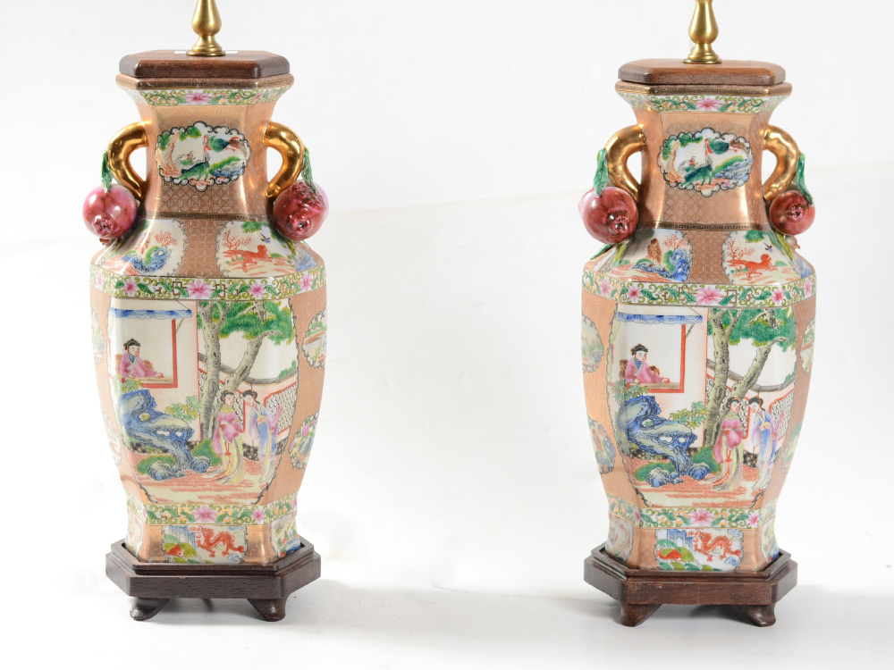 PAIR OF CHINESE ROSE MEDALLION POMEGRANATE LAMPS: Typical rose medallion motifs to body, applied pomegranate fruit, wood bases, single socket fixture, 30 1/2'' h. x 7 1/2'' x 6''. Sold with cloth shades, 12 1/4'' x 14 1/2'' square.