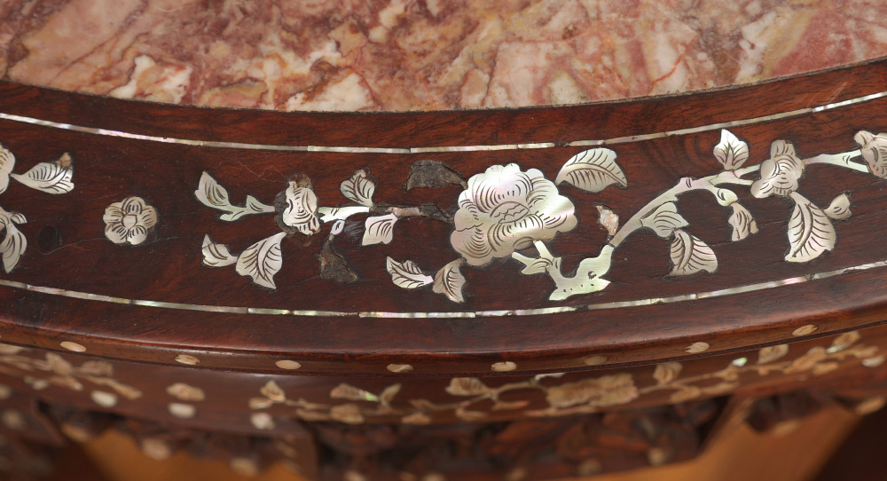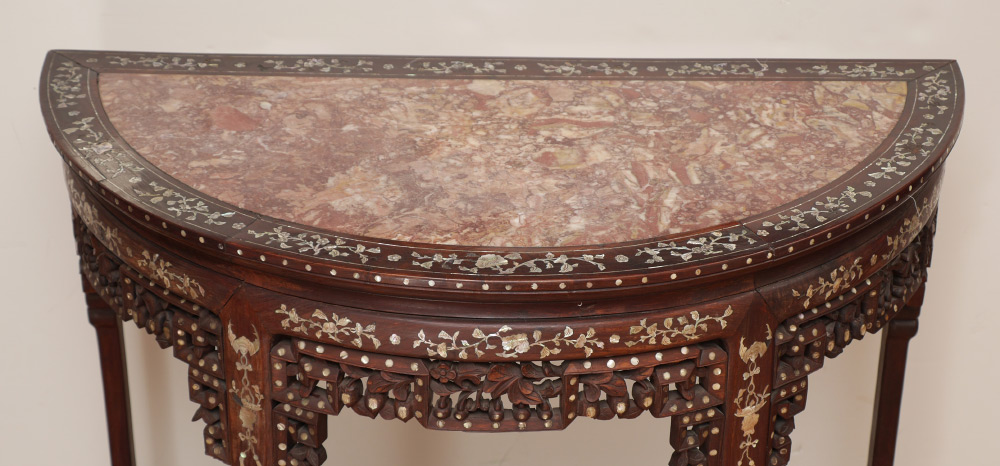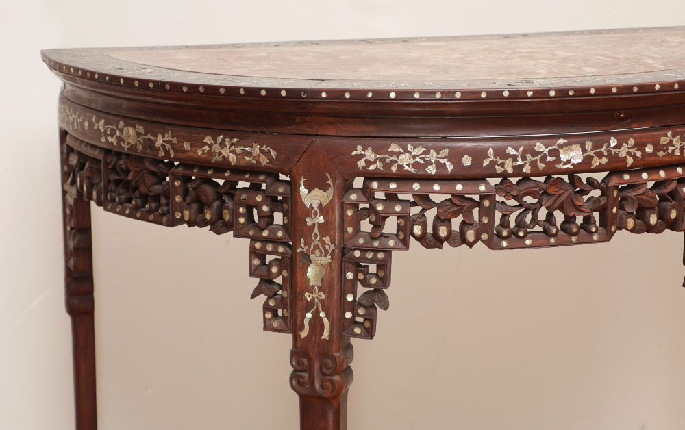 MOTHER OF PEARL INLAID DEMI LUNE HALL TABLE: Inset marble top, floral motif inlaid mother of pearl trim, openwork foliate skirt with matching floral inlay, carved legs. Overall measures 34 1/4'' h. x 41 1/2'' x 20 3/4''. For matching table see next lot.