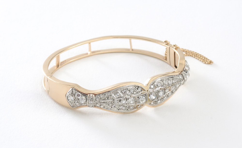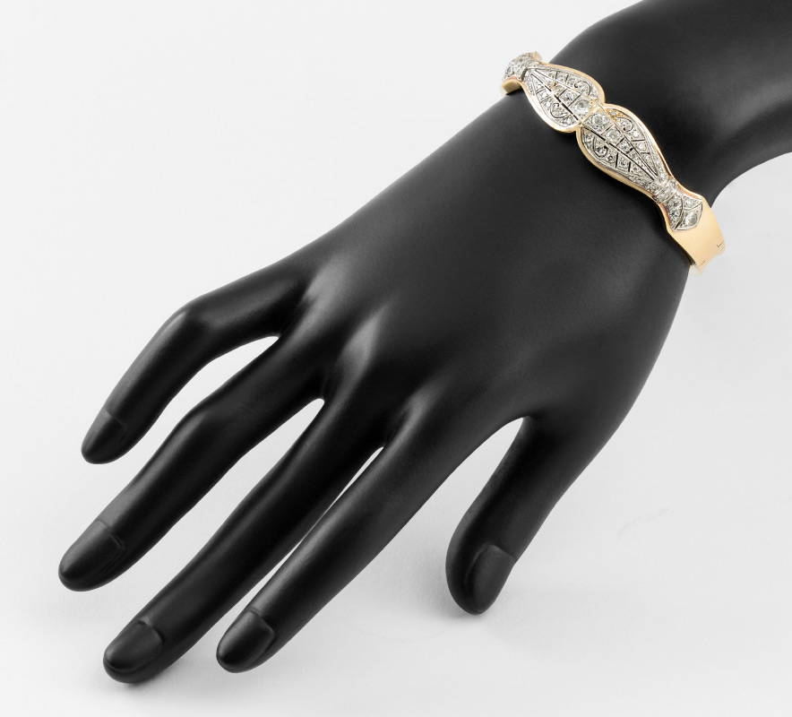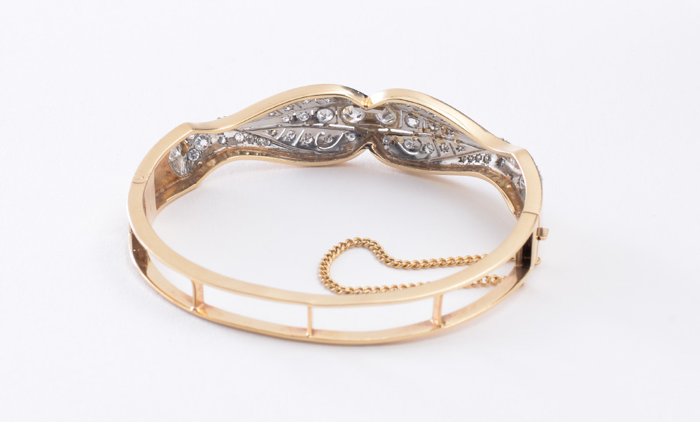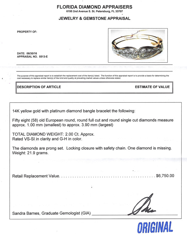GOLD AND PLATINUM 2.0 CT DIAMOND BANGLE BRACELET: 14K Yellow Gold with Platinum bracelet set with 58 old European round, round full cut and round single diamonds. Diamonds are rated VS-SI in clarity, G-H in color and measure approx 1.00mm (smallest) to 3.90mm (largest). Diamonds are prong set. One of the smaller diamonds is missing. Locking closure with safety chain. Weight is 21.9 grams. Sold with current Florida Diamond Appraisers GIA graduates appraisal.