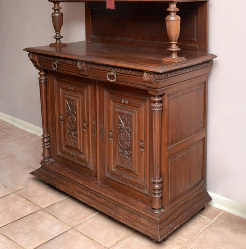 BELGIAN STEP BACK COURT CUPBOARD: Top section, under flared straight crest with carved band, has two doors each set with 12 individual beveled mirror panels, functioning key lock, shelved interior and paneled sides. Open center area with urn shaped supports to front, full panel to back. All on a base of double carved drawers over carved panel doors with interior shelf, matching turned and fluted columns to both top and bottom, raised on feet shaped to front and flat to back. Overall measures 89 1/4'' h. x 52'' w. at top crest, 48'' w. at center x 23''.