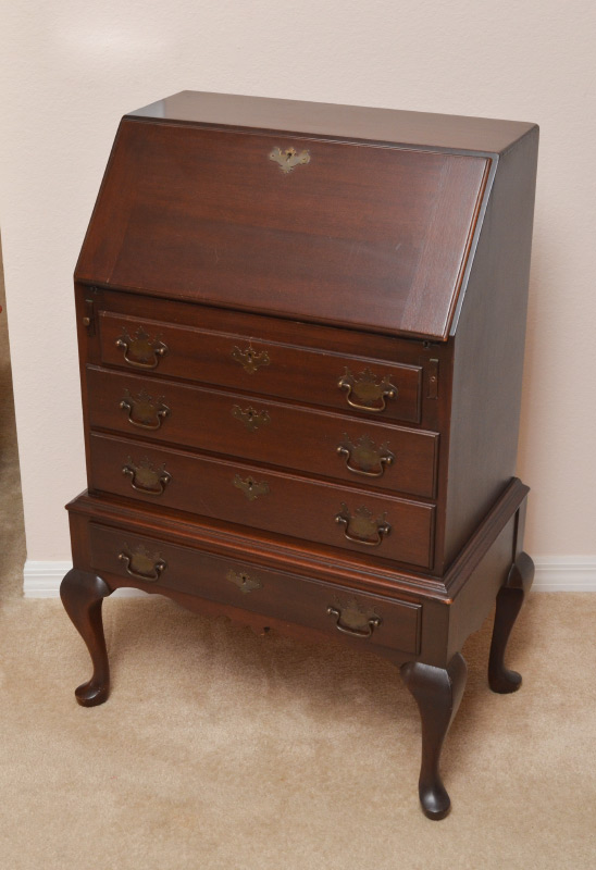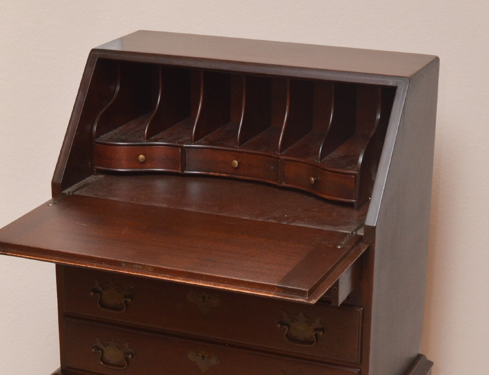 DIMINUTIVE MAHOGANY DROP FRONT DESK: Slant front opens to 3 shaped drawers and pigeon holes over 4 drawers with bat wing brass pulls. Cabriole legs ending in pad feet, overall measures 40'' h. x 27 1/2' x 36 1/4''.