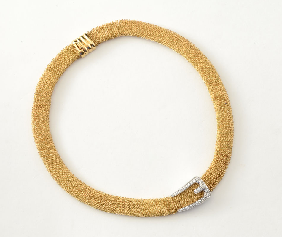 18K ROPE MESH COLLAR NECKLACE: Solid Gold Collar Necklace with a Buckle Center Motif a La Cartier, Stamped Italy, 18K. 28 round brilliant cut diamonds are set into the white gold buckle. Weight 93.0 grams. Sold with current joint Atlanta Gemological GIA graduate's appraisals for $15,000.