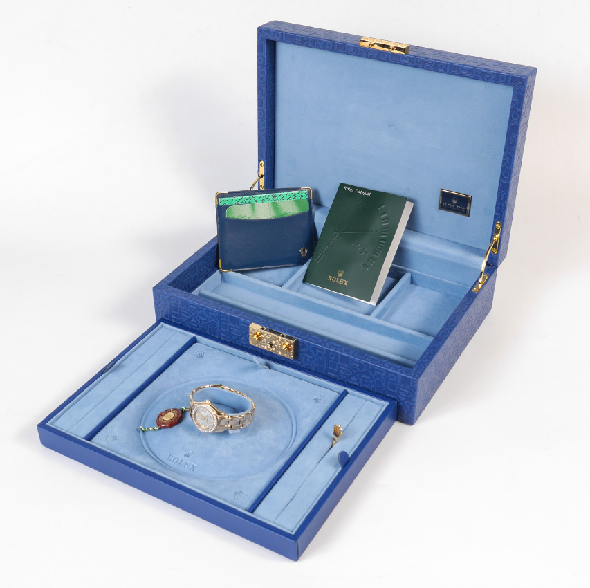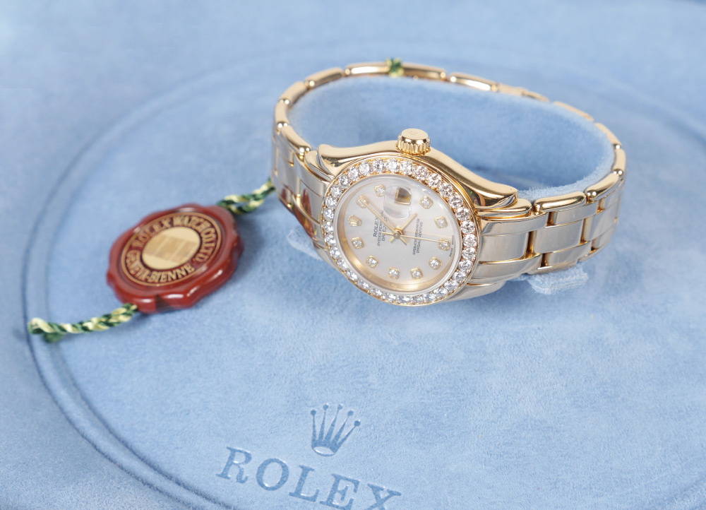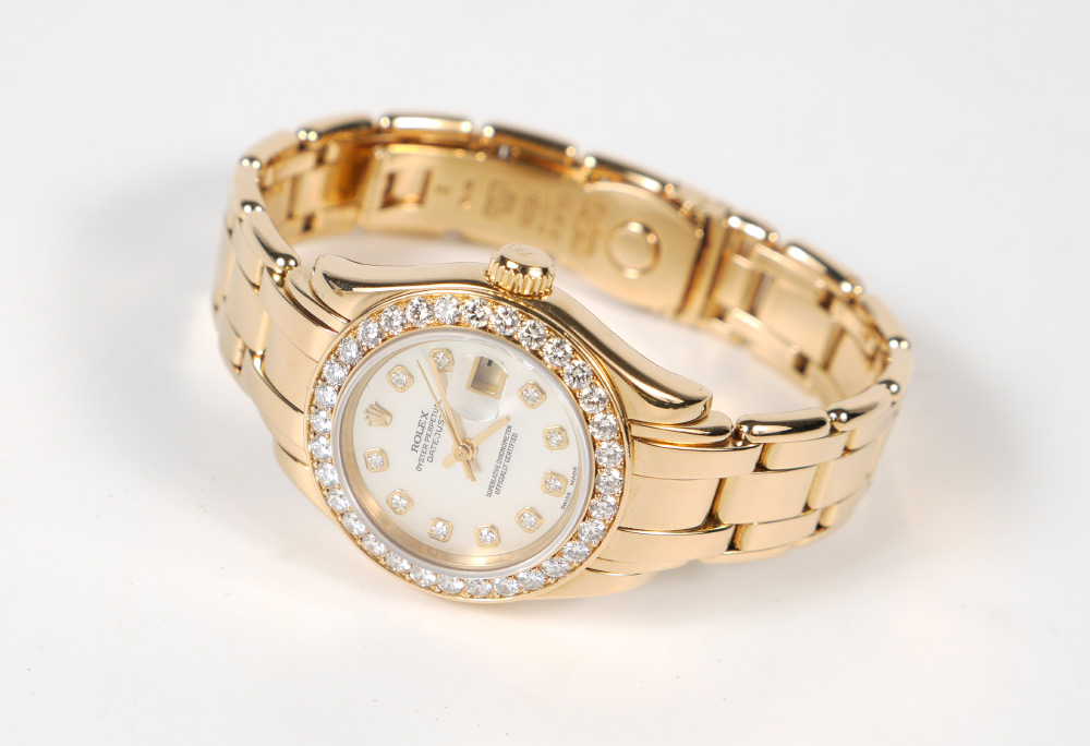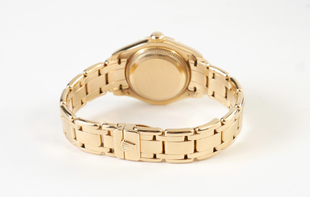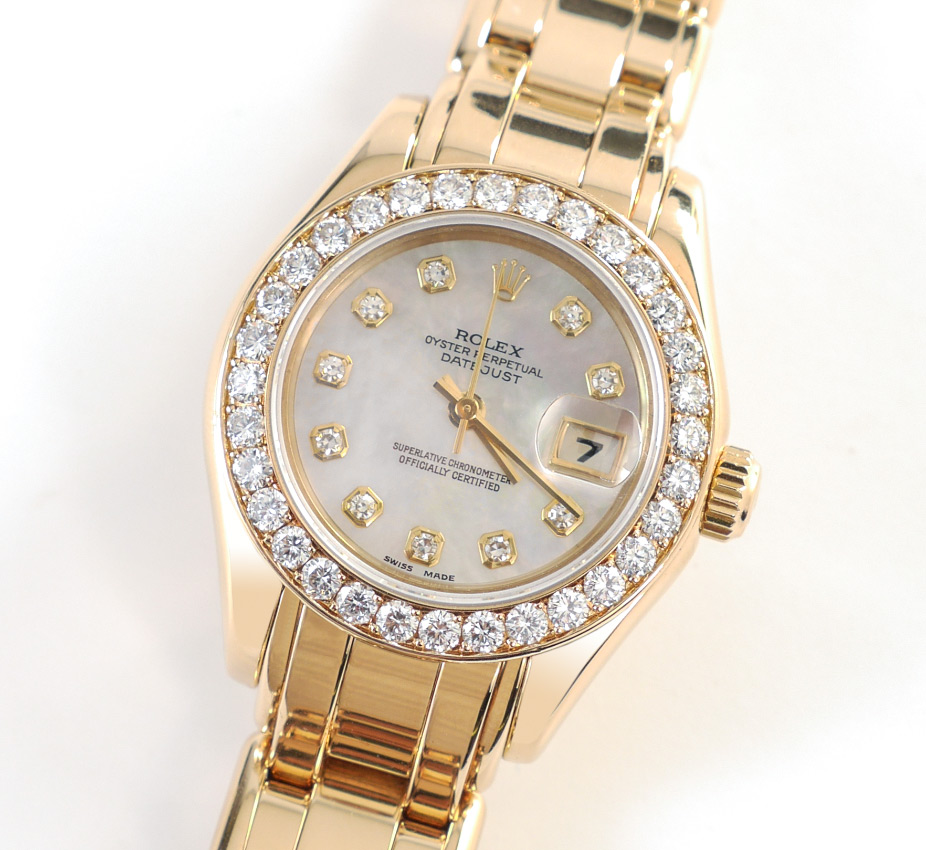 LADIES ROLEX PEARLMASTER 18K YELLOW GOLD WATCH: Beautiful Rolex Datejust Pearlmaster Masterpiece 69298 watch with original Mother of Pearl and Diamond Dial, and Diamond Bezel. 7'' length. In running order - recently serviced by Rolex certified watchmaker. Comes with Rolex wallet, inner and outer boxes and papers.