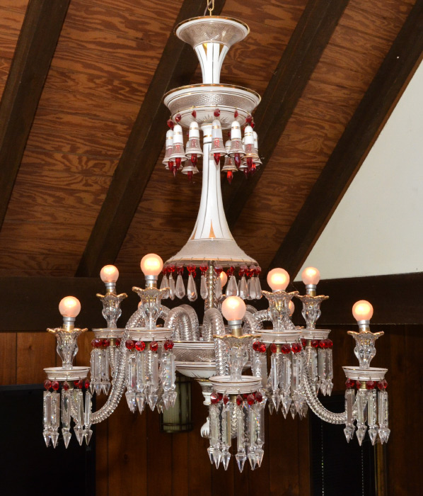 LARGE VICTORIAN ENAMELED CRYSTAL CHANDELIER: 10 light chandelier, cut glass tiered body with white enamel and gilt accents, shaped 10 arms with rope twist, ruby and clear crystal prism drops. Overall measures approx. 38'' h. x 30'' dia.