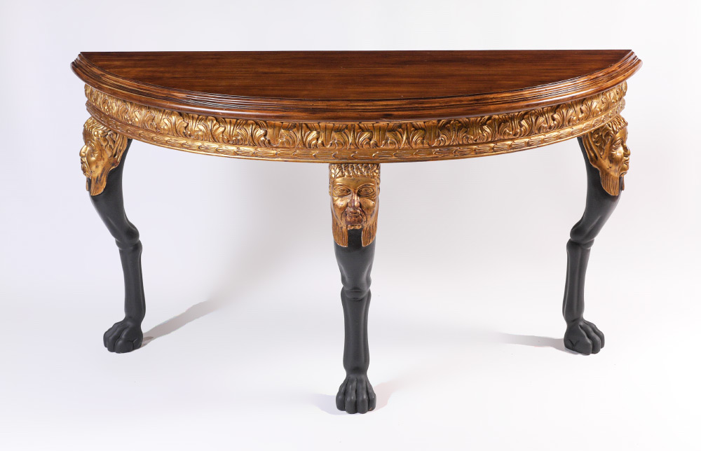 CARVED GILT WOOD DEMI LUNE CONSOLE TABLE: Demi lune shaped top, carved gilt wood foliate motif skirt. Ebonized shaped legs with carved gilt wood masquerons at joints, hoof feet. Overall measures 36'' h. x 65 1/2'' x 22''.