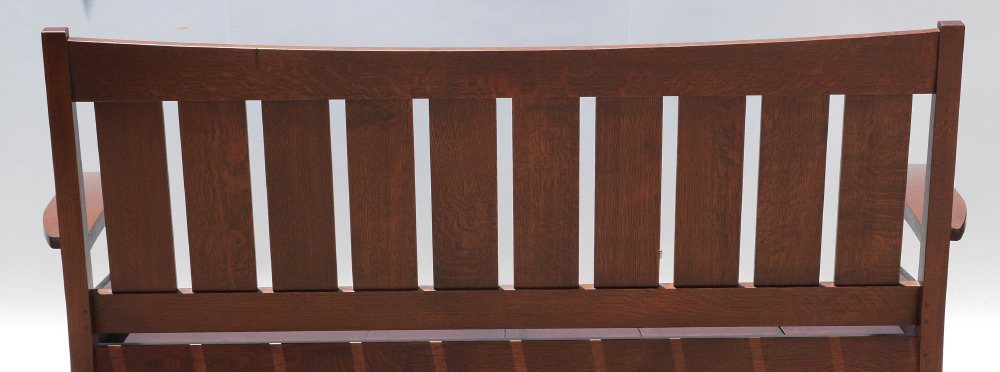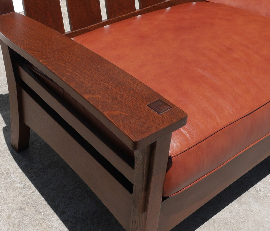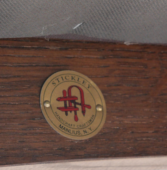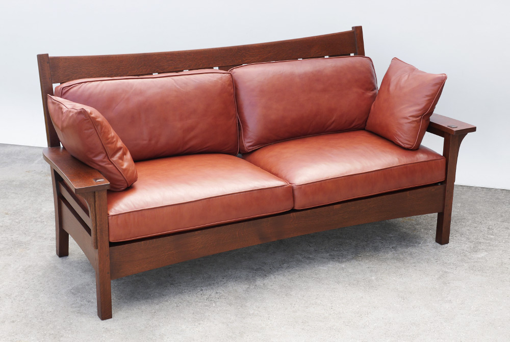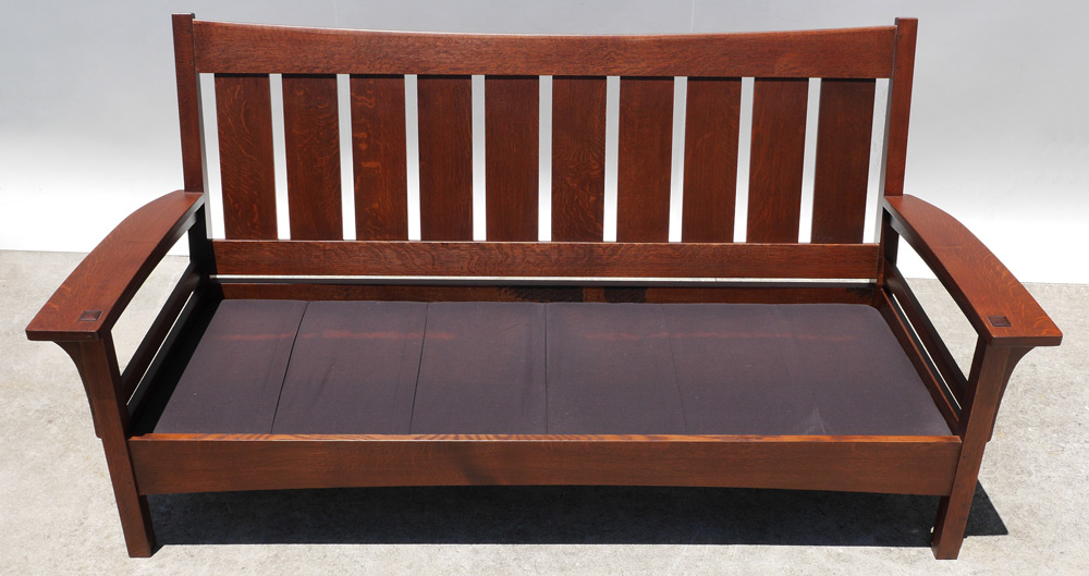 CONTEMPORARY STICKLEY FURNITURE SETTLE: 21st century production, oak frame stamped Stickley under front skirt, brown leather upholstery and throw pillows. Measures 39 3/4'' h. x 83 1/4'' x 36''.