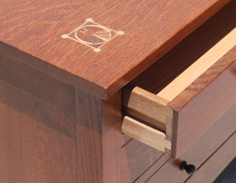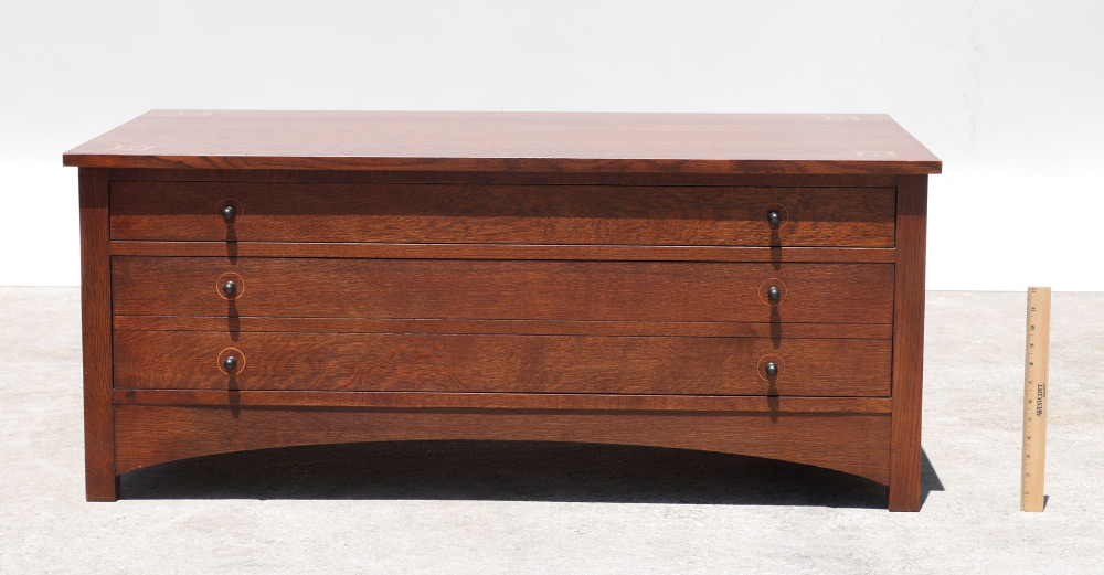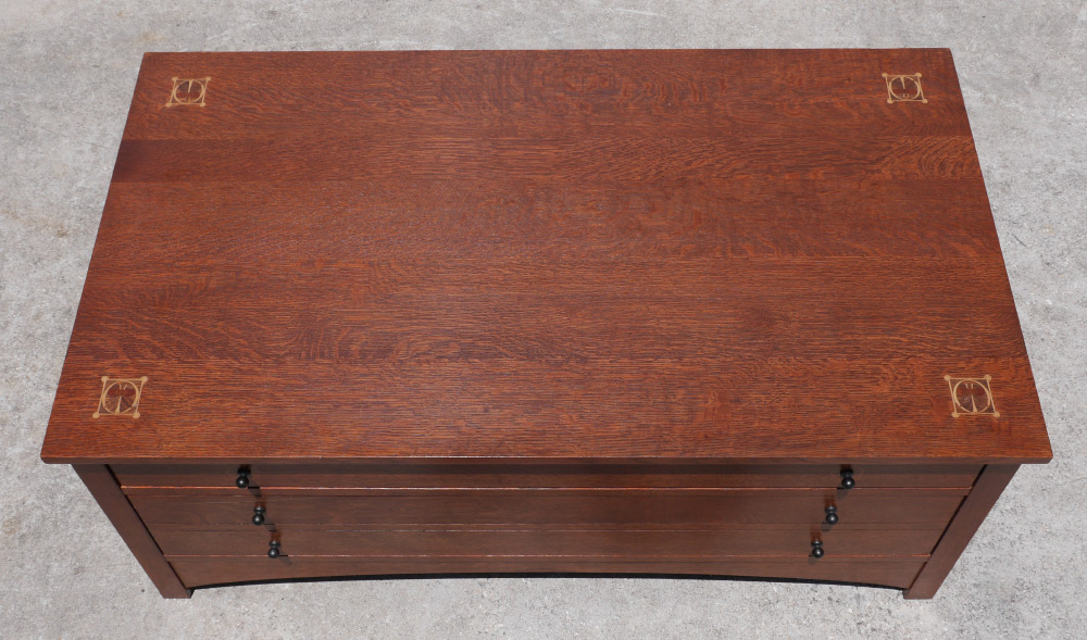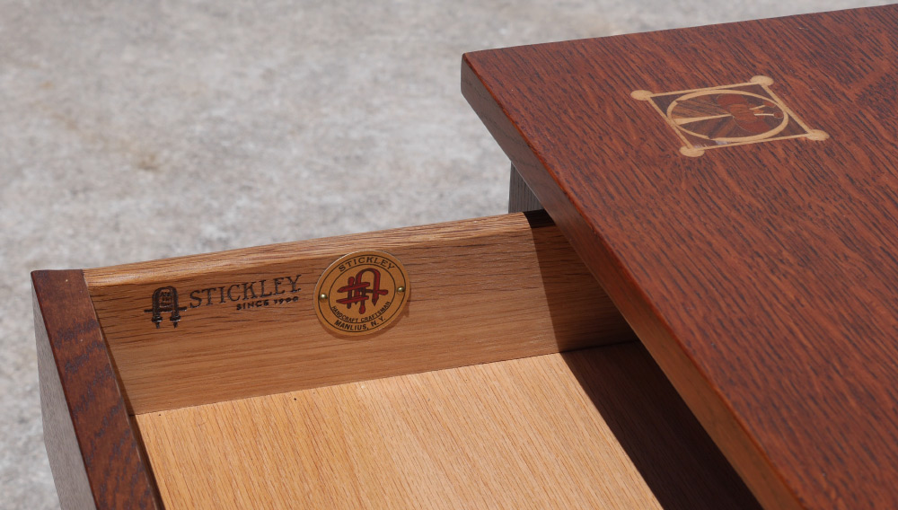 CONTEMPORARY STICKLEY HARVEY ELLIS STORAGE COCKTAIL TABLE: Top with inlaid design at each corner, shallow drawer over deep drawer on one side, shaped skirt. Stamped Stickley with badge inside top drawer. 19'' h. x 46'' x 26''.