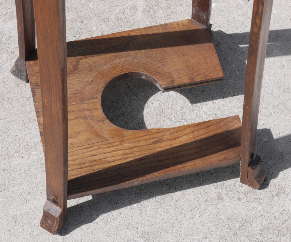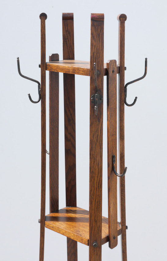 ARTS & CRAFTS OAK COAT RACK / UMBRELLA STAND: 2 open shelves at top, cut out open shelf at base for umbrellas, no insert. No visible markings, measures 67 1/2'' h. x 16'' x 14 1/2''.
