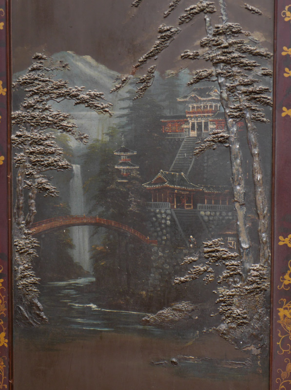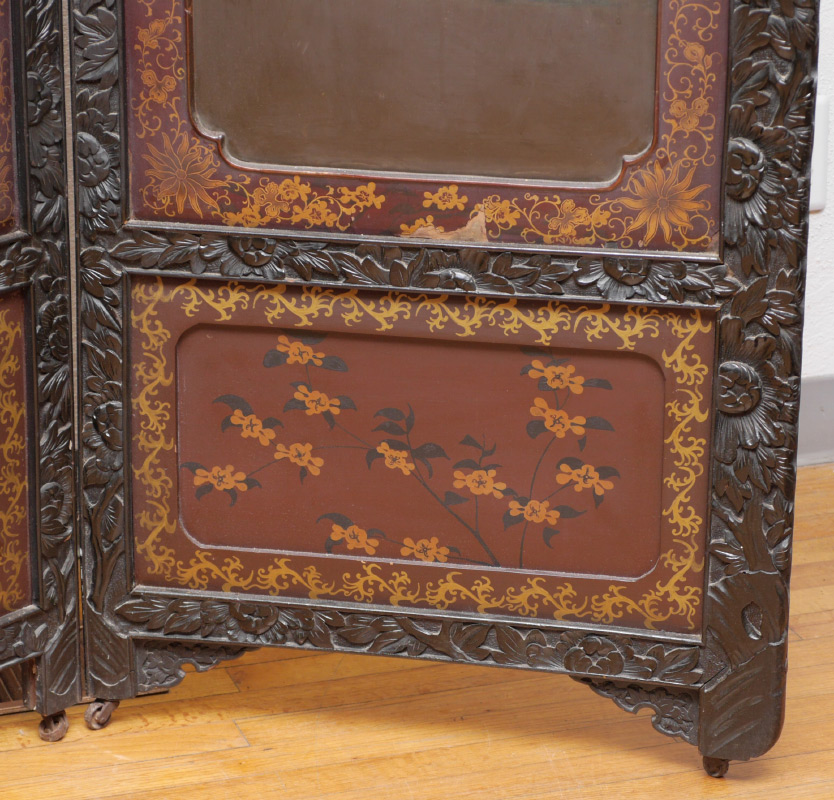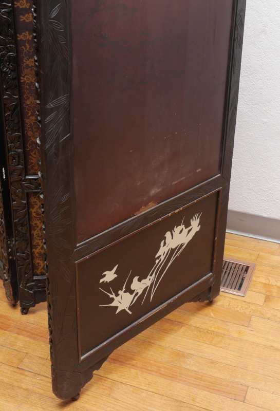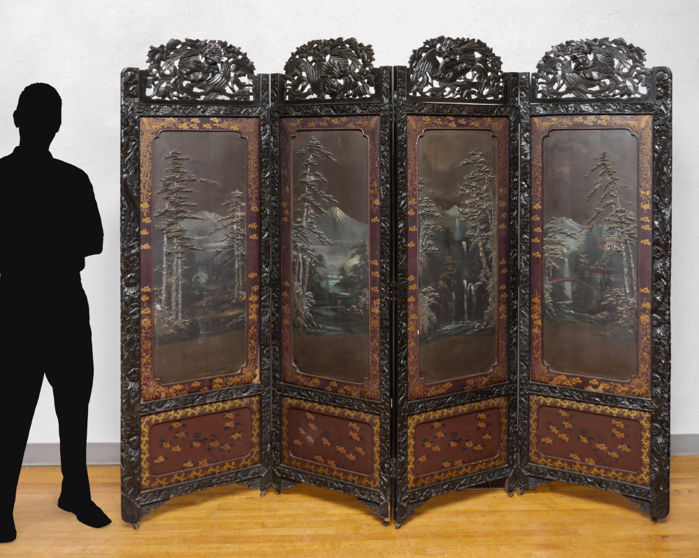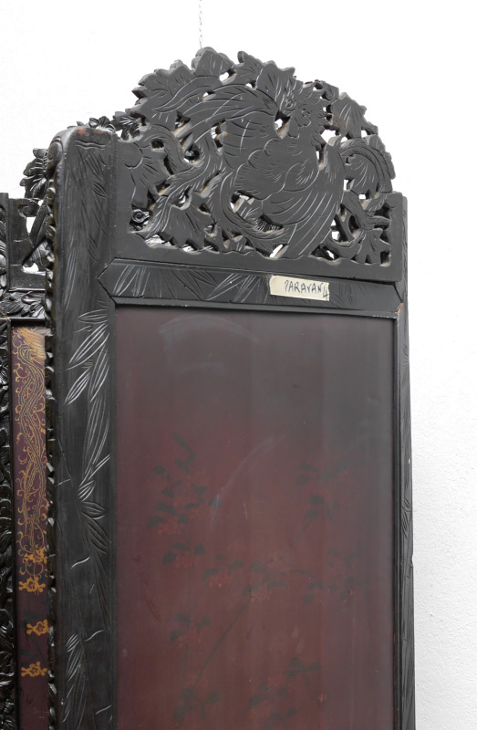 4 CARVED ORIENTAL FLOOR SCREEN PANELS: Each panel with mythological bird carved crest, floral motif frames, top section with hand painted landscape scene and applied raised trees, lower section with painted floral motif, gilt painted borders, 76'' h. x 25 1/4'' x 1 1/4''.