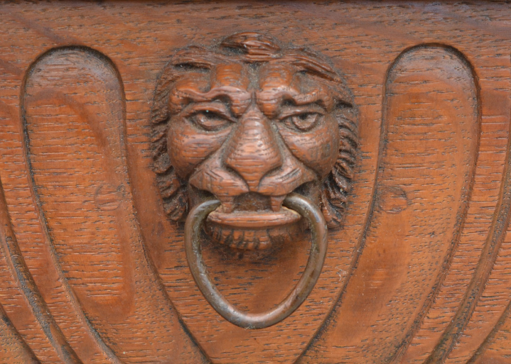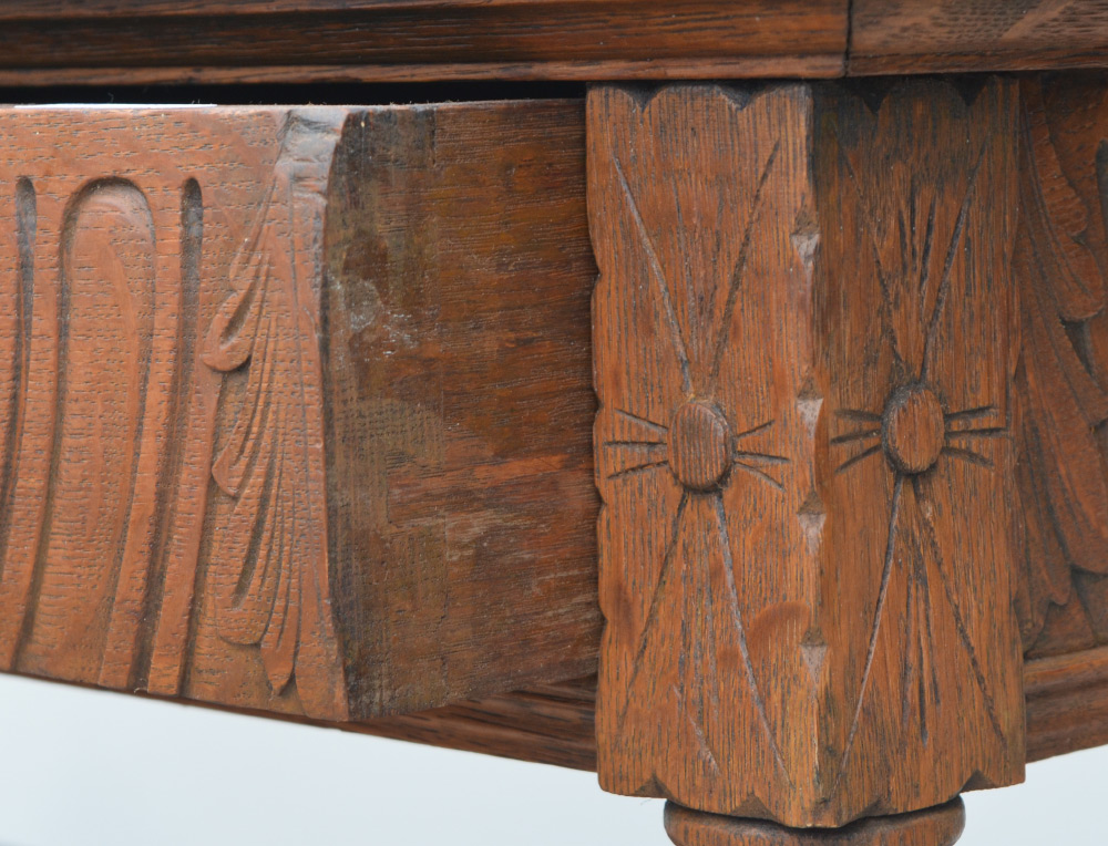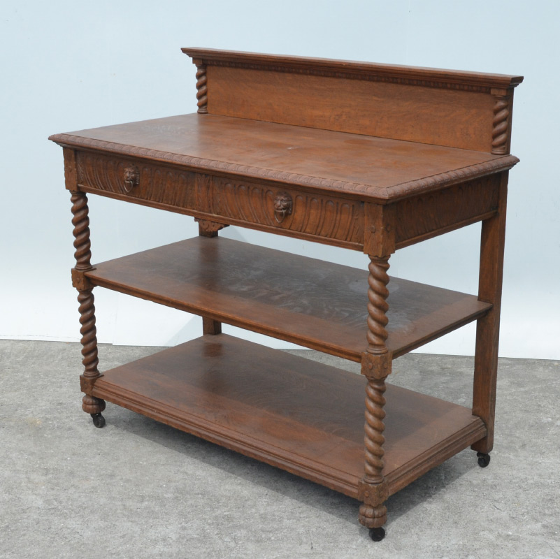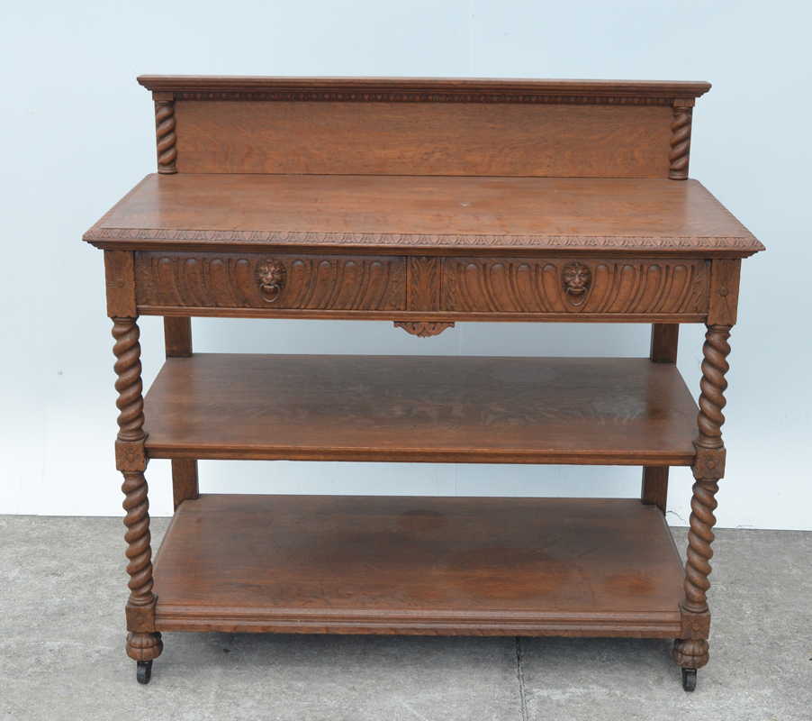CARVED OAK SIDEBOARD: Backsplash with carved barley twist half columns over rectangular top with egg and dart motif trim. 2 half drawers with lion masqueron and brass ring pulls, barley twist front legs, 2 open shelves, all on castors. 45'' h. x 48'' x 24''.
