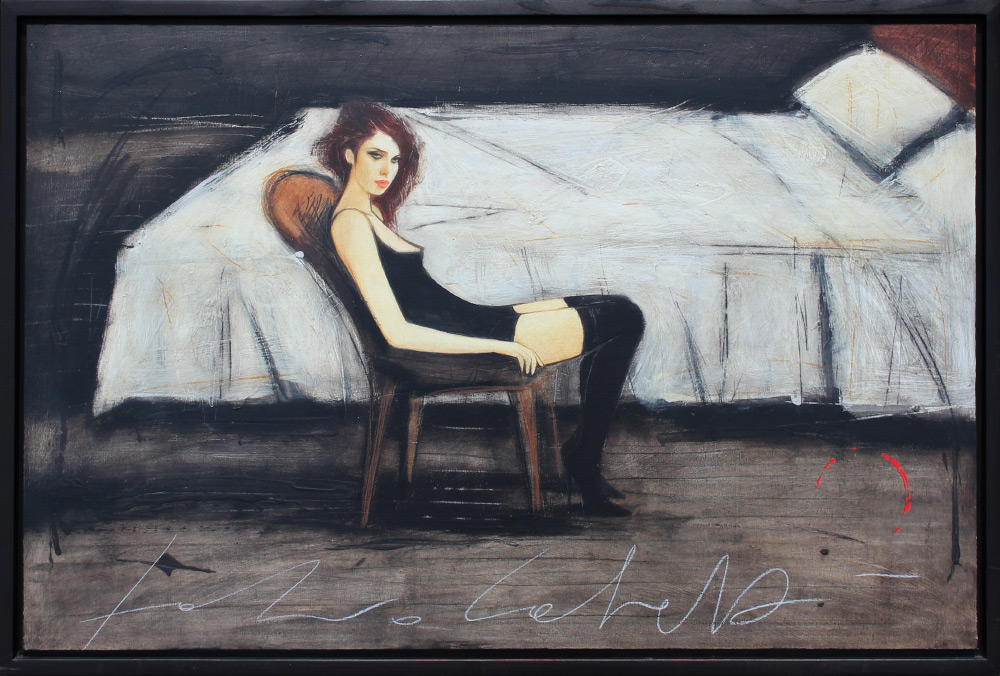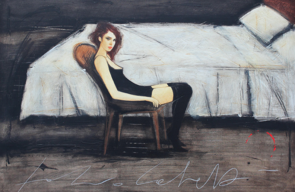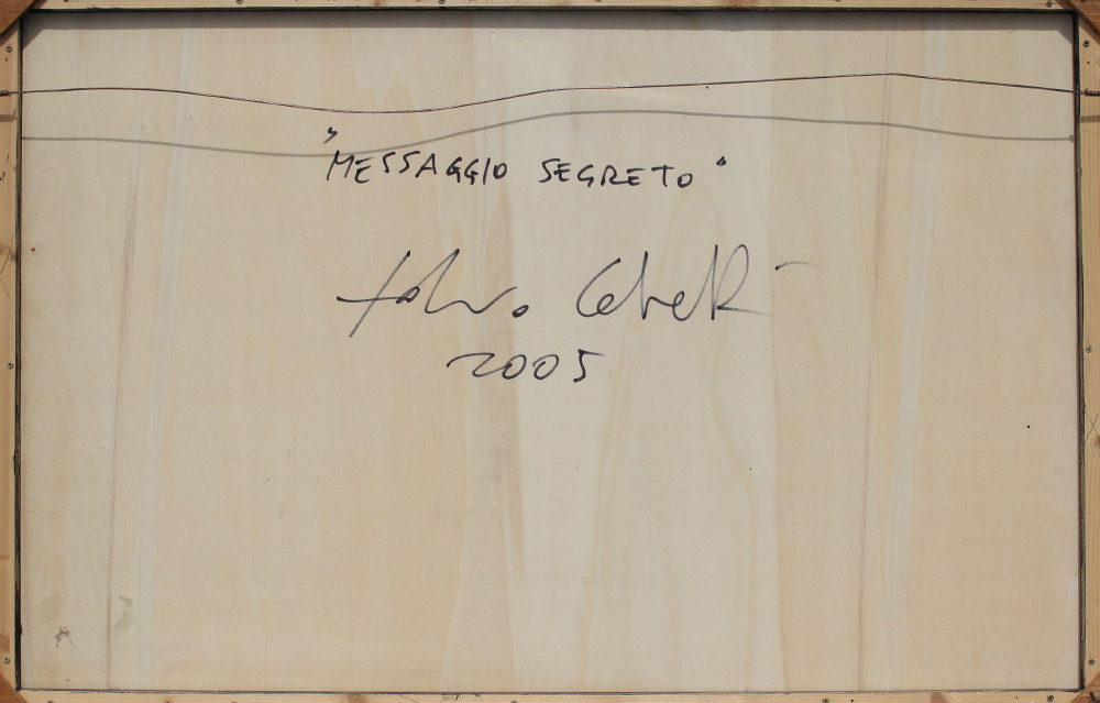 CALVETTI, Fabio, (Italian, 1956-): ''Messaggio Segreto'', Oil/Board, 25.625'' x 39.5''. Signed lower margin, signed, titled and dated verso 2005, custom framing, 27.75'' x 41.5''. Former Collection of Medici Gallery Sarasota Florida. Cost: over 1,800.
