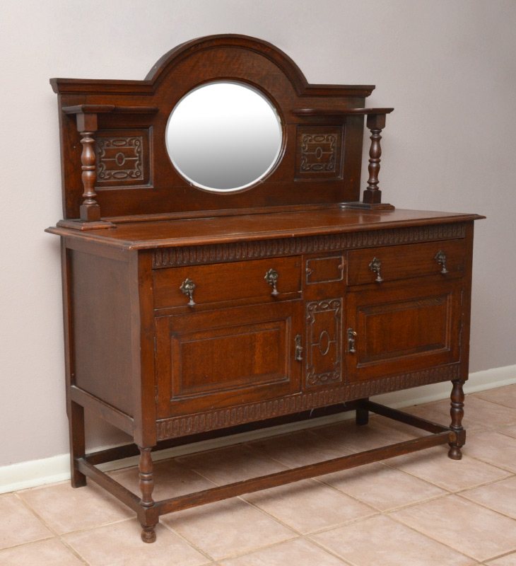 WALNUT CARVED SIDEBOARD: Arched crest, central oval mirror, open shelves with turned column supports over carved panels. Base with 2 drawers over 2 doors, carved center, turned front legs, door knocker pulls. Overall measures 60'' h. x 54 1/4'' x 18 1/2''.