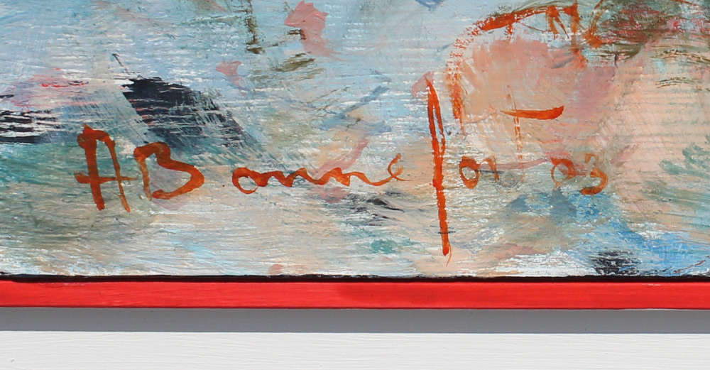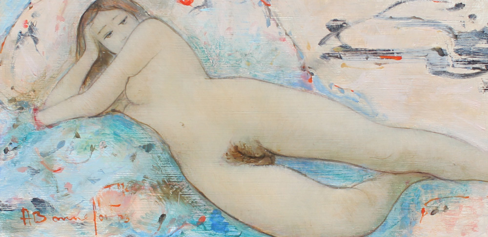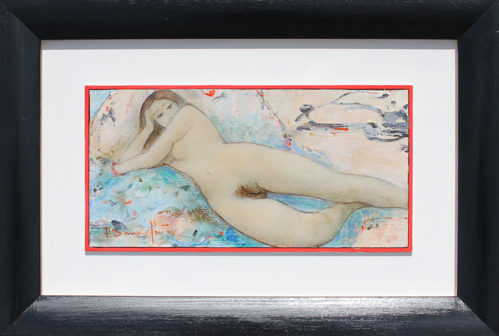 BONNEFOIT, Alain, (French, 1937-): Reclining Nude, Oil/Board, 9'' x 18.5'', signed lower left, titled verso, custom frame 19.5'' x 29''. Former Collection of Medici Gallery Sarasota Florida. Bonnefoit entered L'Ecole des Arts Applique and L'Ecole des Beaux-Arts in 1953, before enrolling at the L'Ecole des Beaux Arts in Brussels to study Engraving and Sculpture. He became a student of and friends with Volti and under his influence Bonnefoit began to focus on painting female nudes. He is the master of Sumi-e, an East-Asian form of ink and wash painting. Cost: over 2,000.