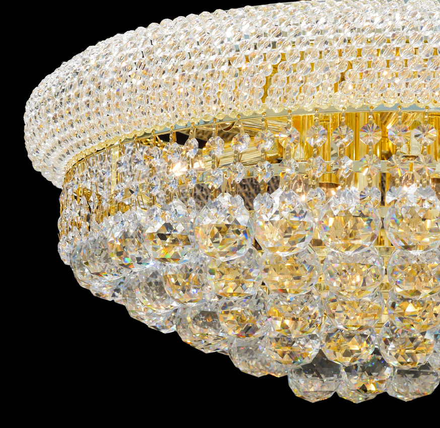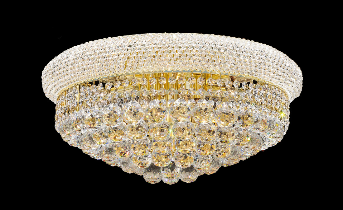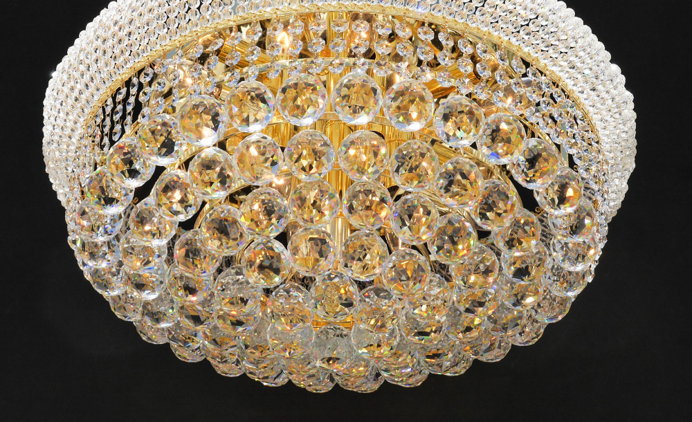 PRIMO 10 LIGHT FLUSH MOUNTED CHANDELIER: Circular brass frame with 10 lights, beaded border, faceted ball drops, model 1800F20 by Elegant Lighting. Overall measures 10'' h. x 21 1/2'' dia.