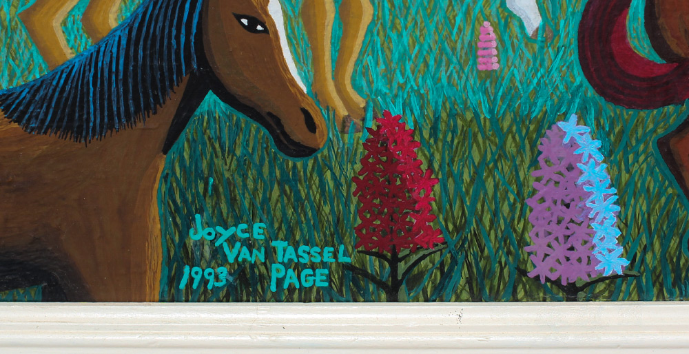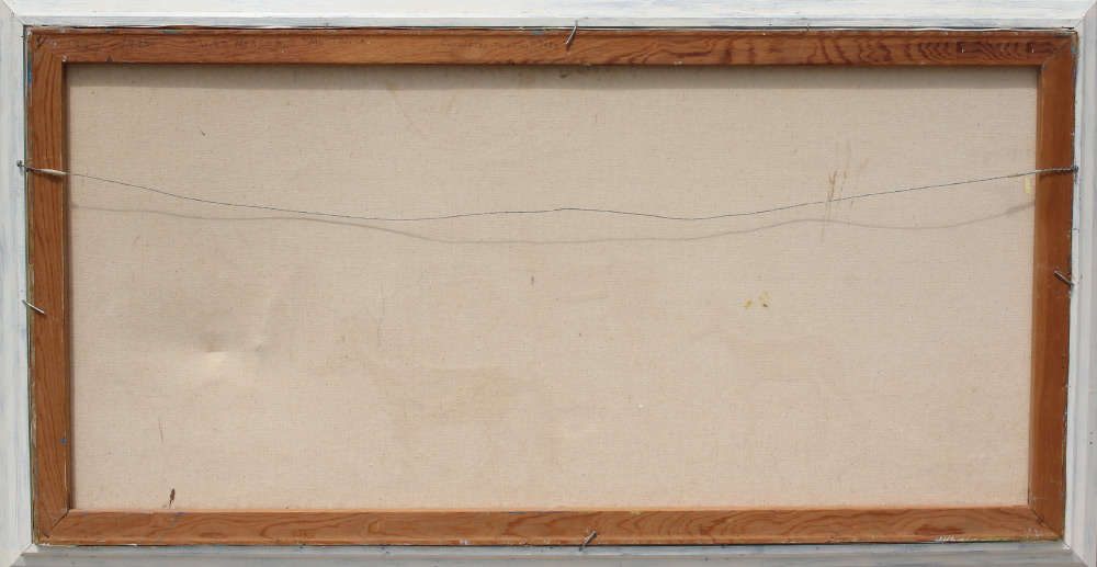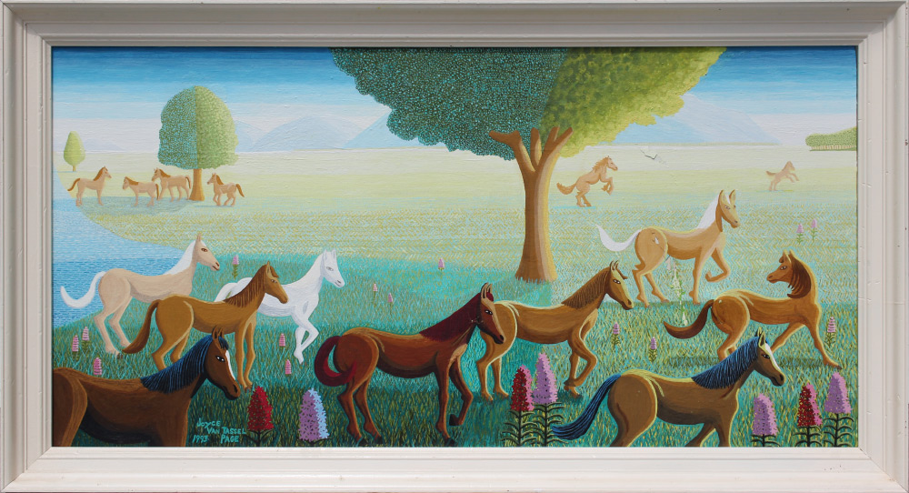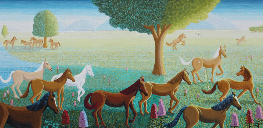 VAN TASSEL PAGE, Joyce, (American, 20th Century): Wild Horses-Mustang, Oil/Canvas, 23.75'' x 48'', signed lower left, painted white frame, 20.5'' x 52.5''. From the estate of the undiscovered artist Joyce Van Tassel Page.