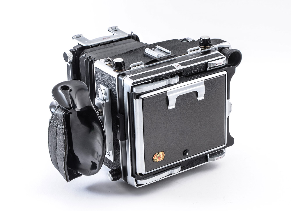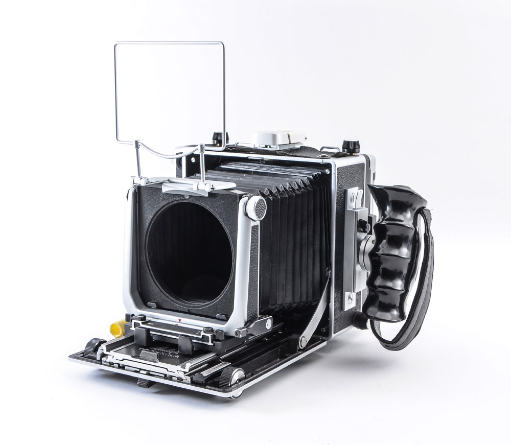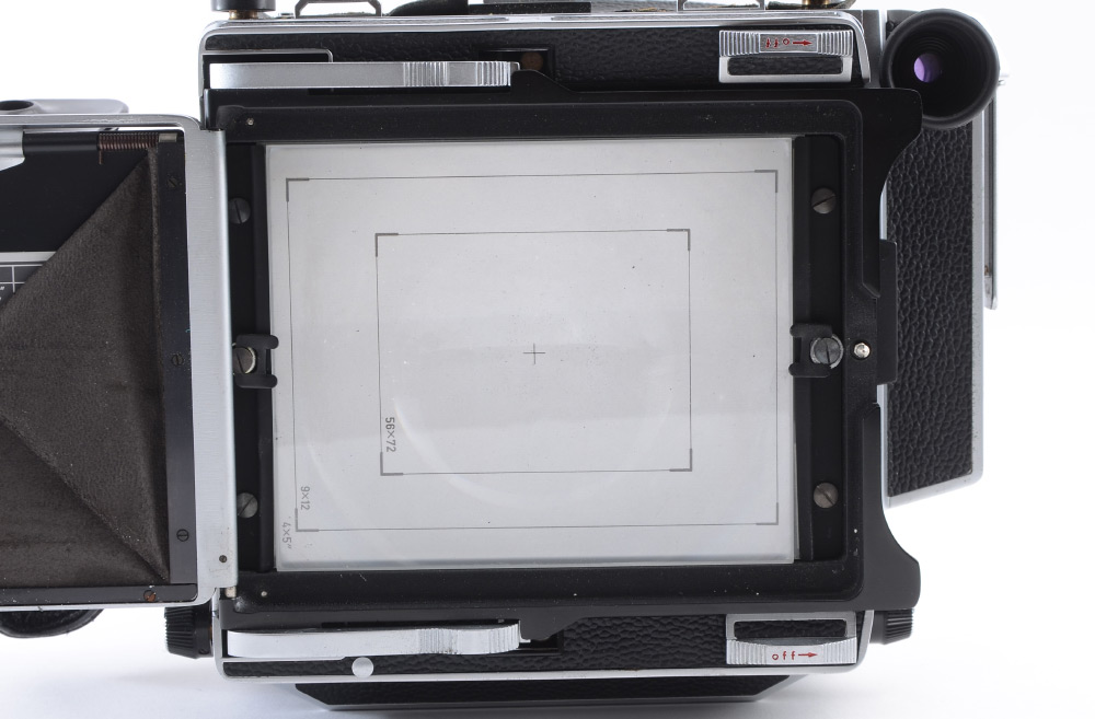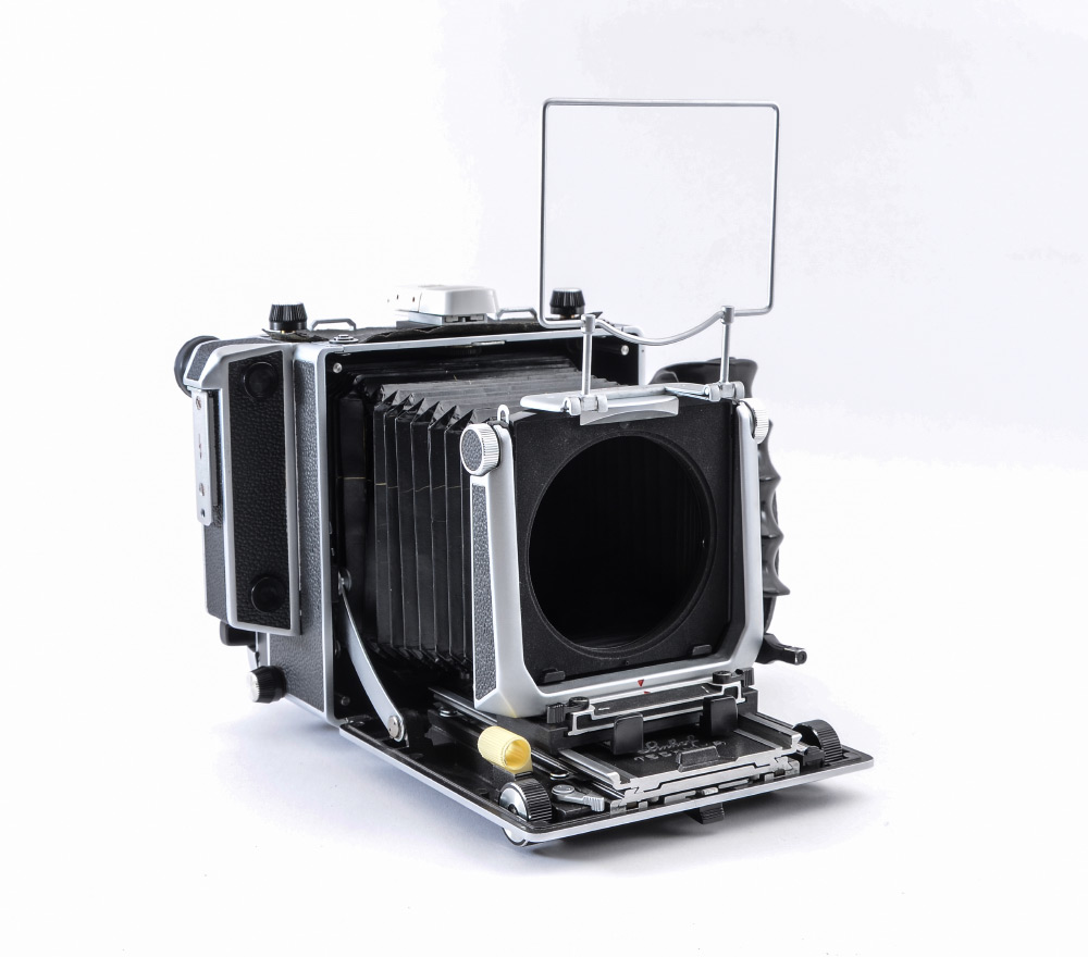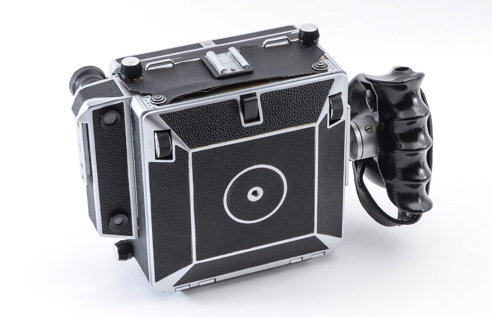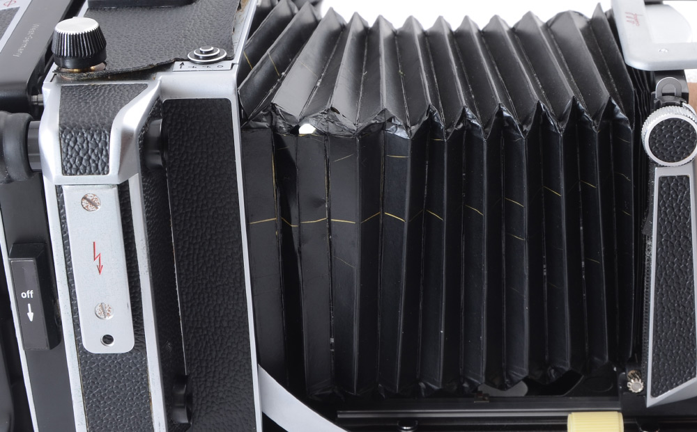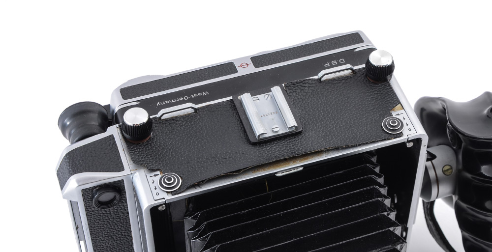 CONDITION: Chrome has pitting in a few small areas - overall condition is good. Top leather panel needs restoration or re-adhesion. At least one small pinhole in the bellows that requires repair. Creases in bellows are not crisp. Fresnel glass could use cleaning.