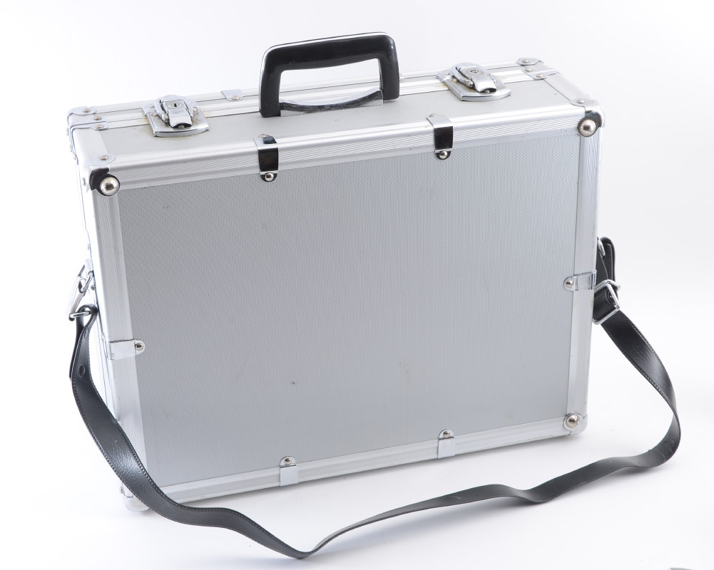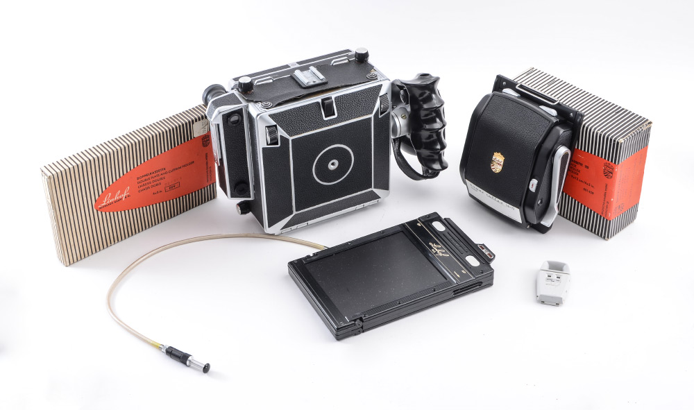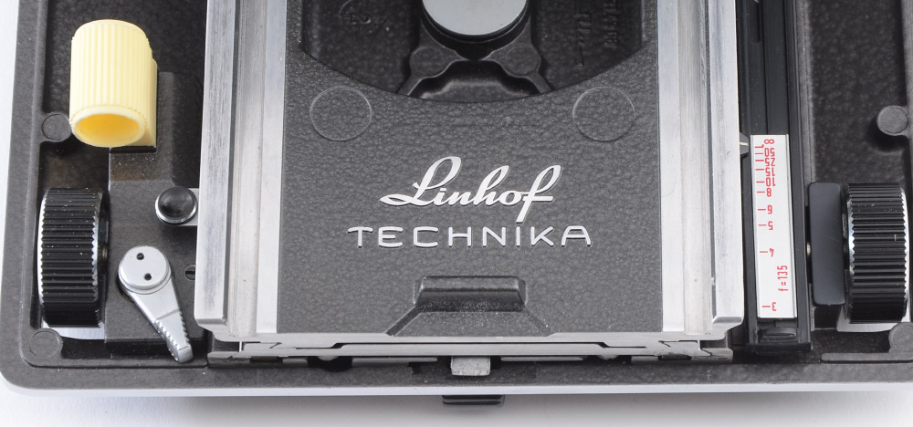 LINHOF MASTER TECHNIKA 4X5 CAMERA: Linhof Master Technika large format camera manufactured in the mid-1980s. Serial #6421568. Comes with left hand grip, rangefinder, a Linhof duplex 4x5 film holder, and a Linhof Super Rollex 4x5 film holder. Also includes cabled shutter release, and metal carrying case.