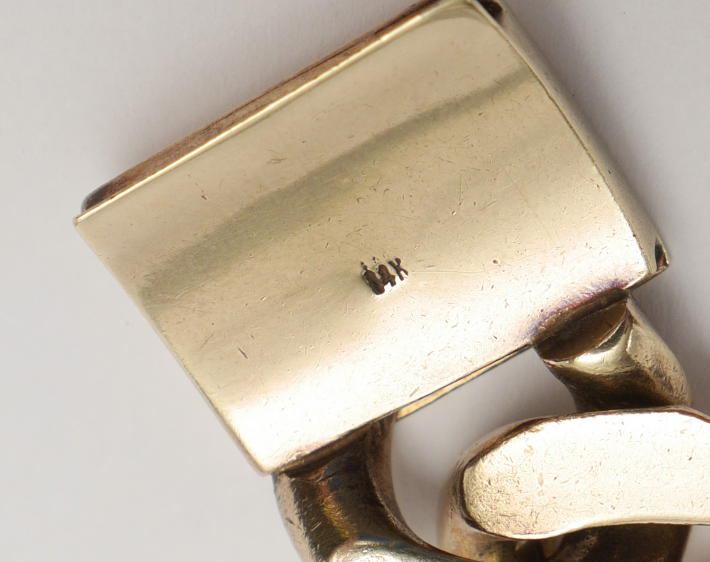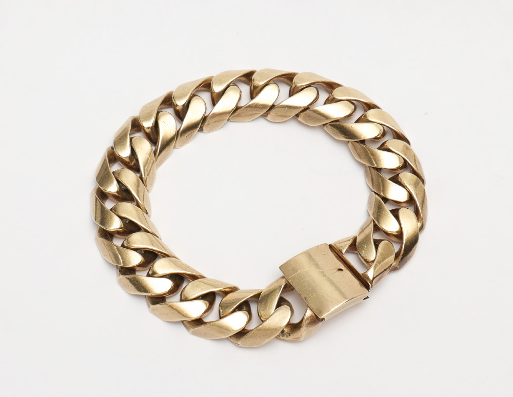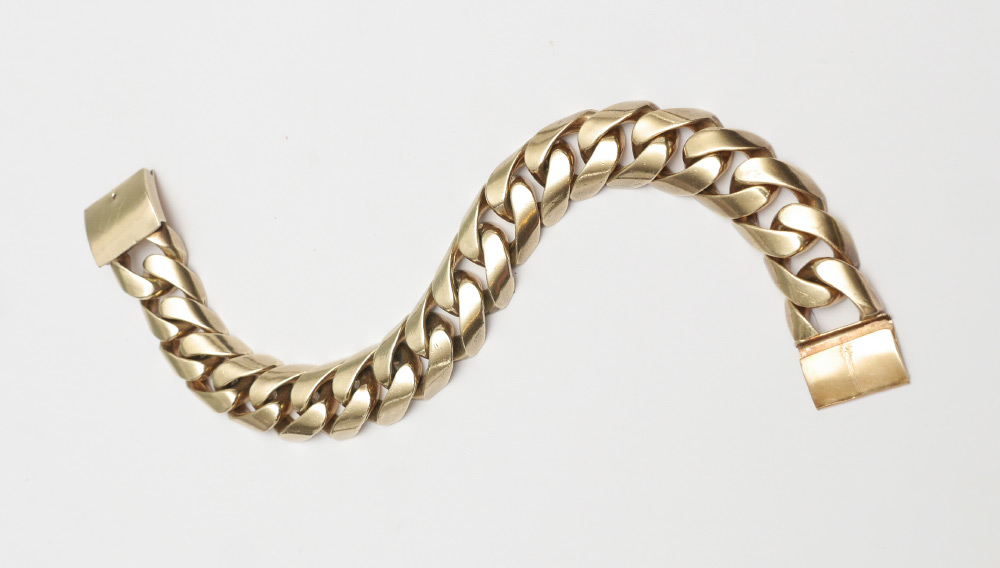 14K GOLD LINK BRACELET: Marked 14k, unmarked as to maker, 9'' long, self-locking pressure clasp, approx. 129.8 grams.
