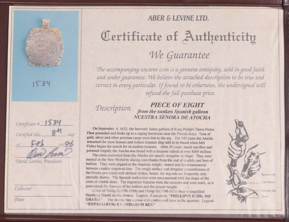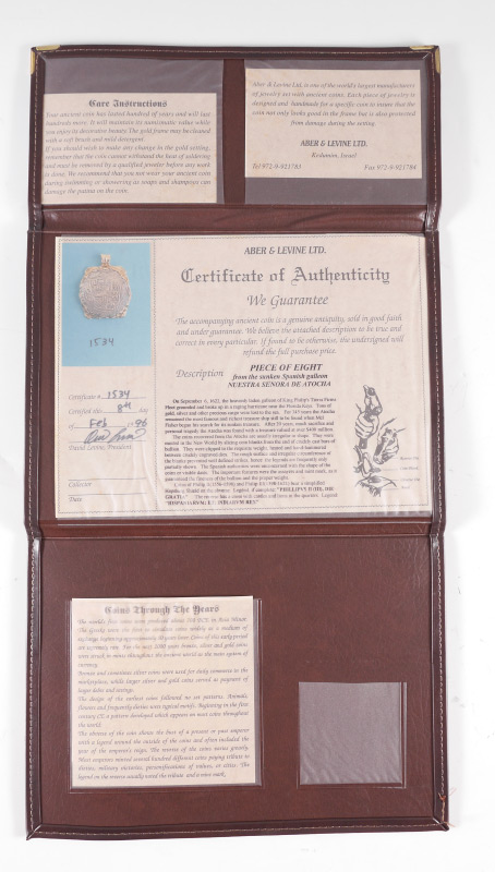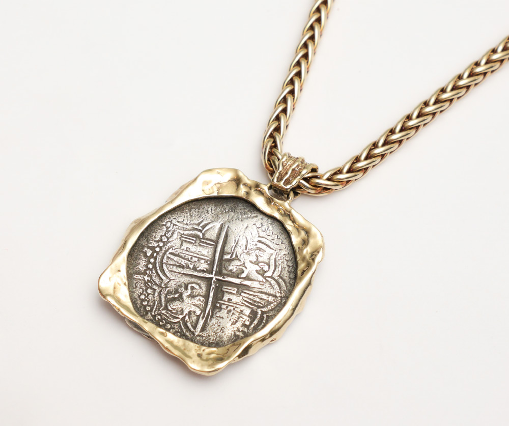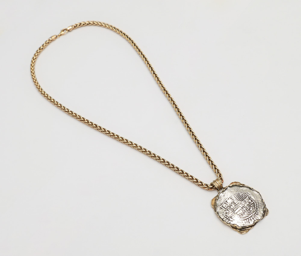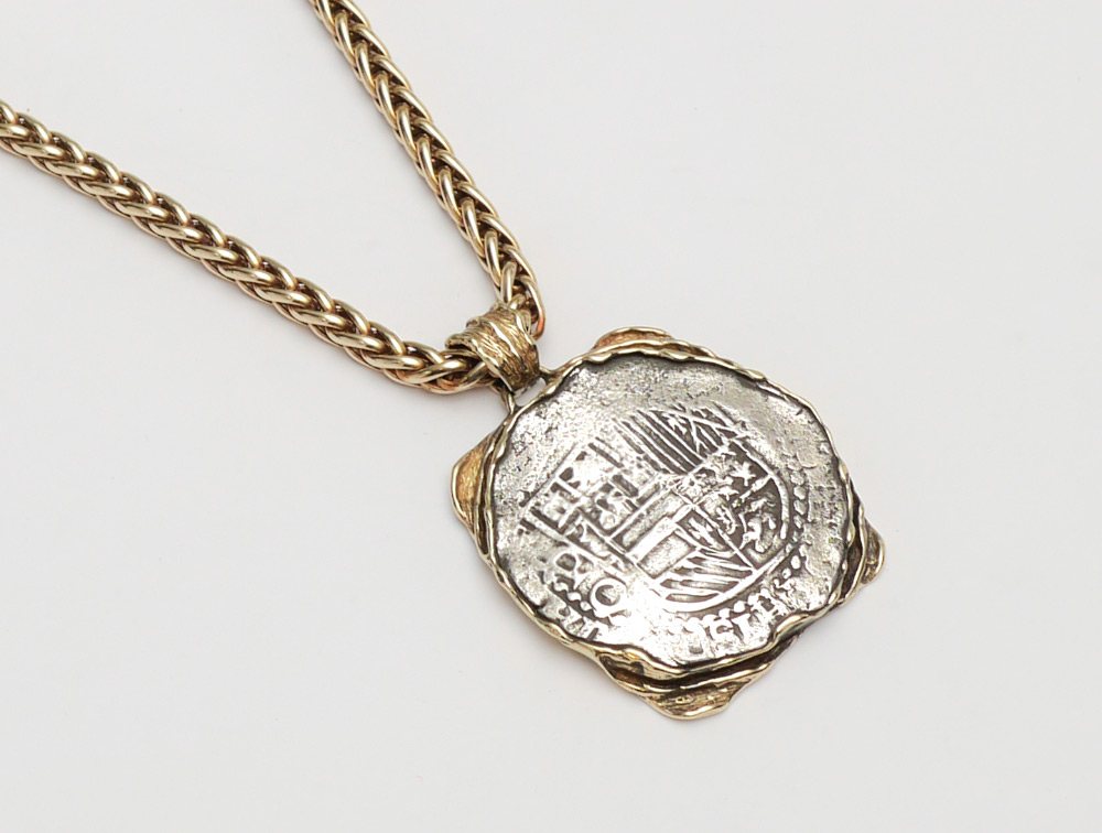 ATOCHA 8 REALES SILVER COIN PENDANT & GOLD CHAIN: ''Piece of Eight'' silver coin mounted in gold frame with certificate from Aber & Levine dated 1996. Sold with a 14K Italian gold chain, 23'' long. Gold chain weighs approx. 26.6 grams, overall weight with coin 64.1 grams.
