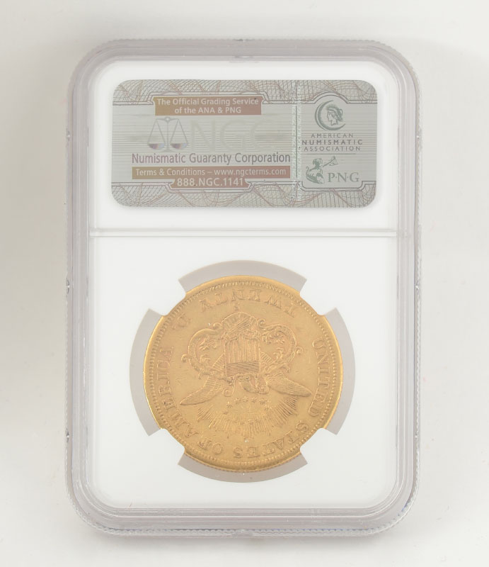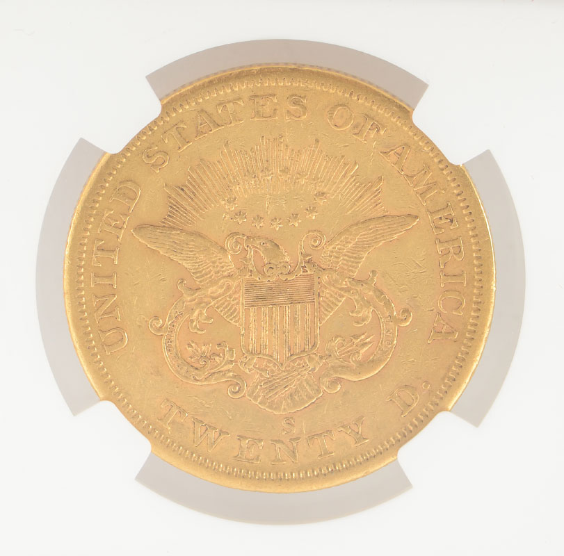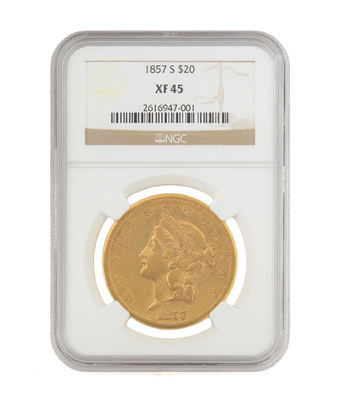 1857-S DOUBLE EAGLE $20 GOLD COIN NGC XF45: Slabbed and graded NGC XF-45.