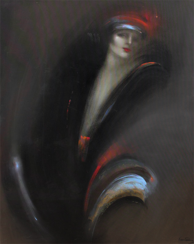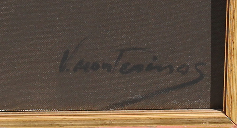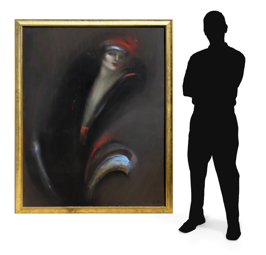 MONTESINOS, Victoria, (Mexican, 1944-): Seated Beauty in Black with Red and Lavender Hat, Oil/Canvas, 60'' x 48'', signed lower right, framed, 65'' x 53''. Montesinos was born in Mexico as the only daughter of well-known movie director, Fernando A. Rivero. She loved to draw from early childhood and by twelve she had the opportunity to paint with Jose Bardasano, for five years. In the 1980s, Victoria moved to New York to work with a gallery to study developing high quality lithographic works and Victoria's talent then became recognized in the US. She returned to Mexico in the late 1980's and developed a new style through her oil paintings and serigraphs on textiles. When Montesinos returned to New York, painting flowers became her focus and she described them as an incredible way for nature to show the infinity of existing colors.