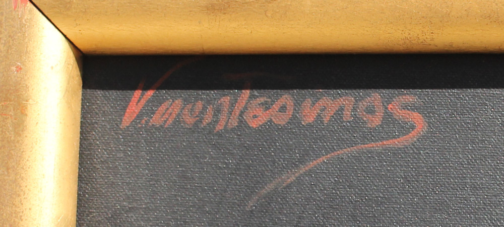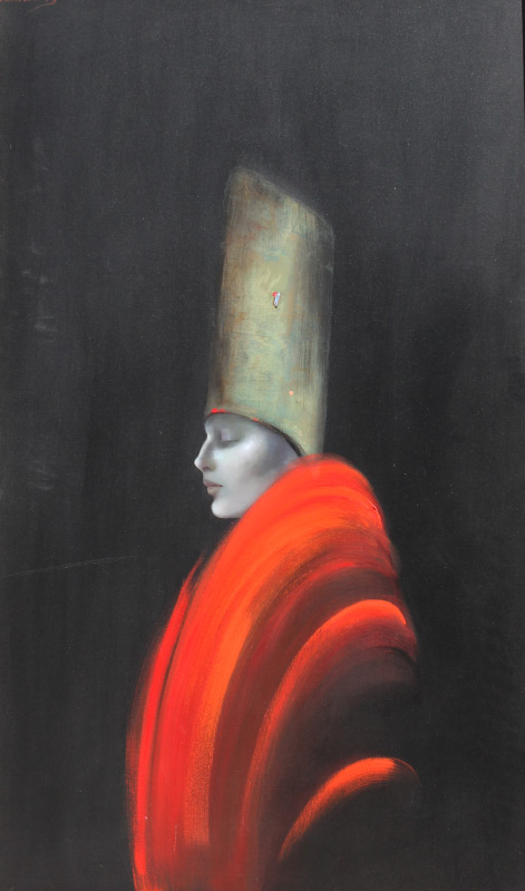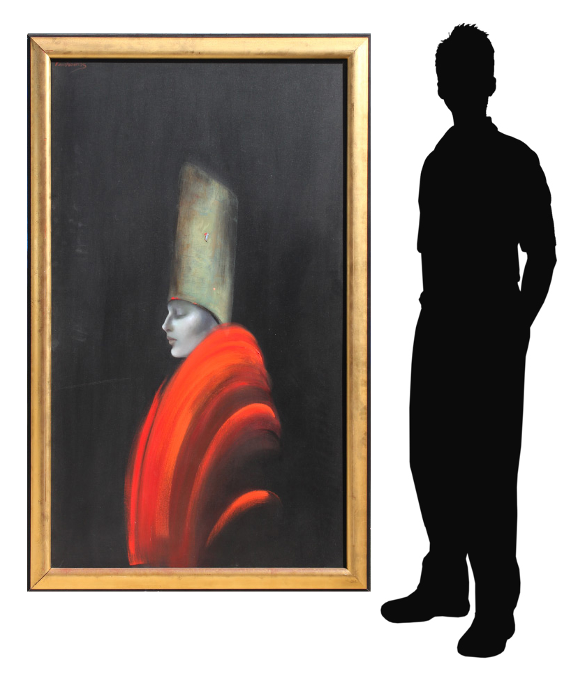 MONTESINOS, Victoria, (Mexican, 1944-): Beauty in Red Jacket and Tall Hat, Oil/Canvas, 60'' x 36'', signed upper left, framed, 65'' x 41.5''
