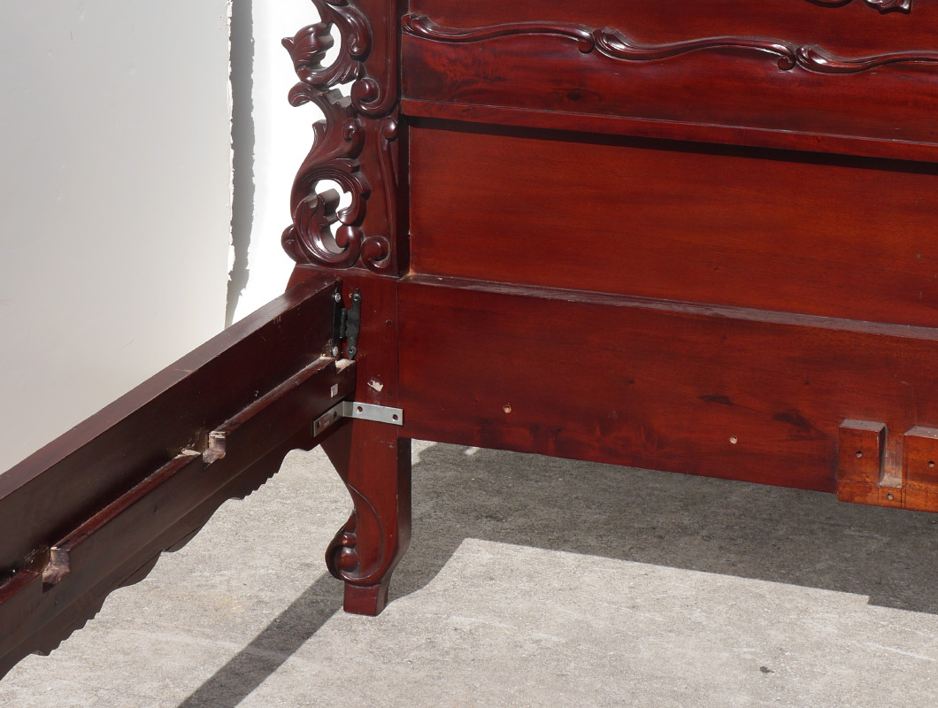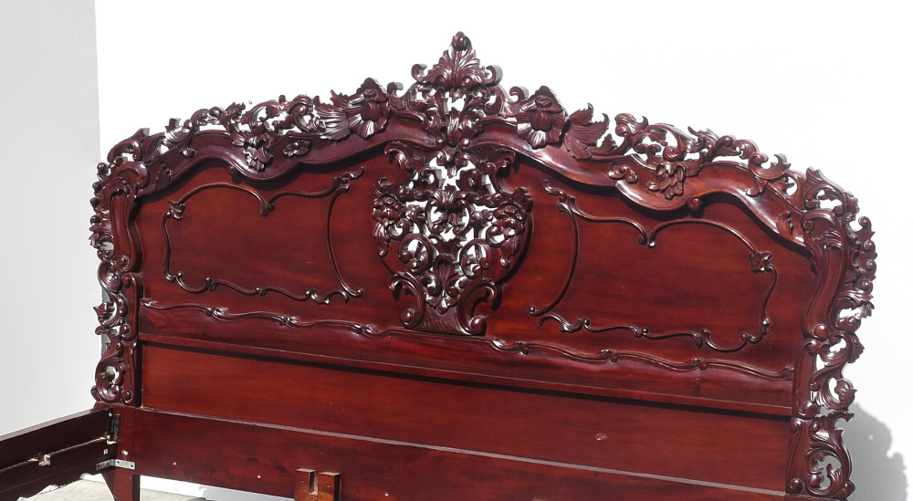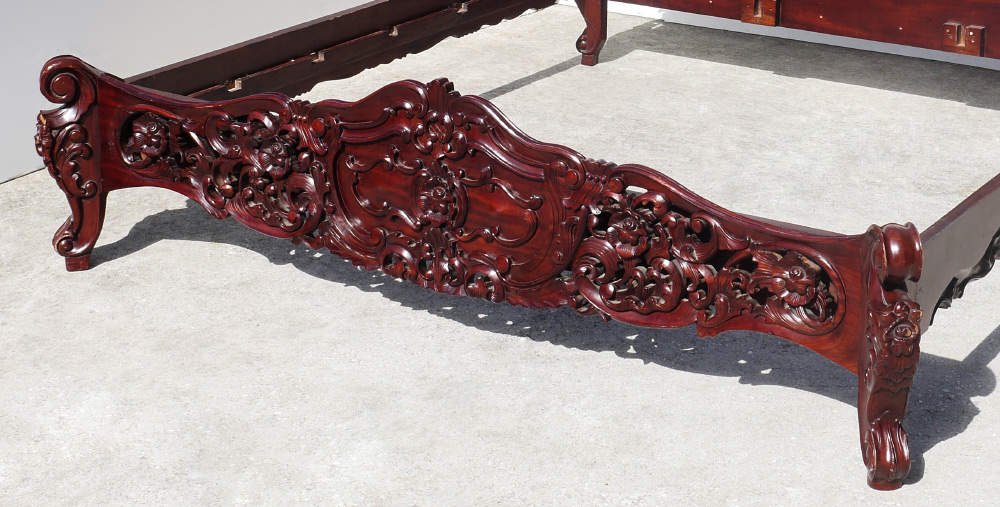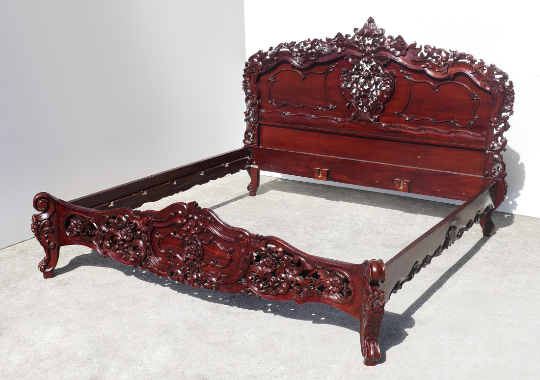 KING SIZED CARVED MAHOGANY BED: Heavy carved rich dark Indonesian mahogany, king size headboard and foot board. Carved, open cut and applied molded panels. Headboard measures 57'' h. x 87'' x 18''