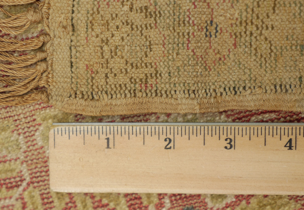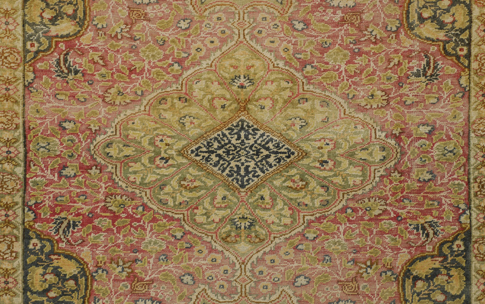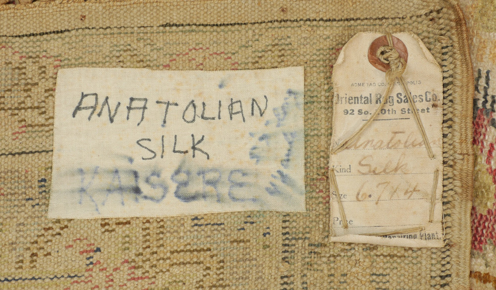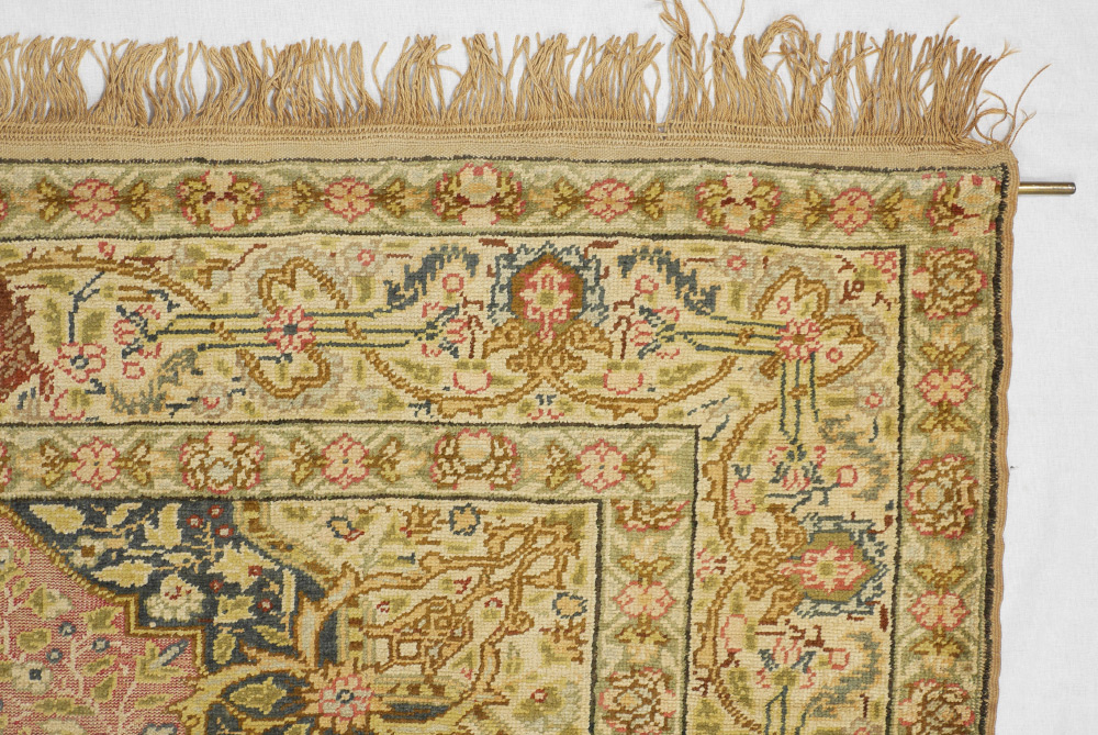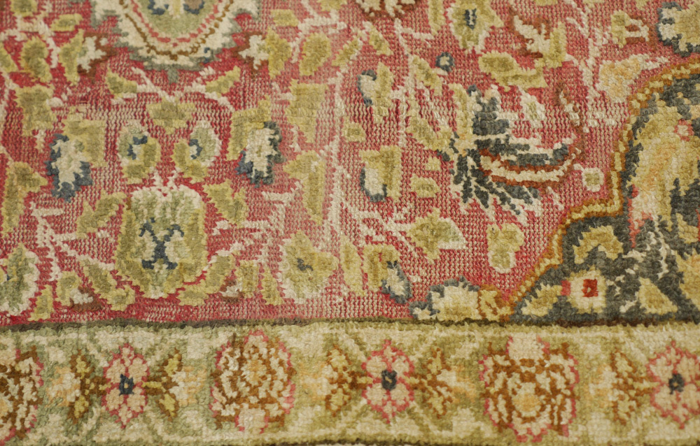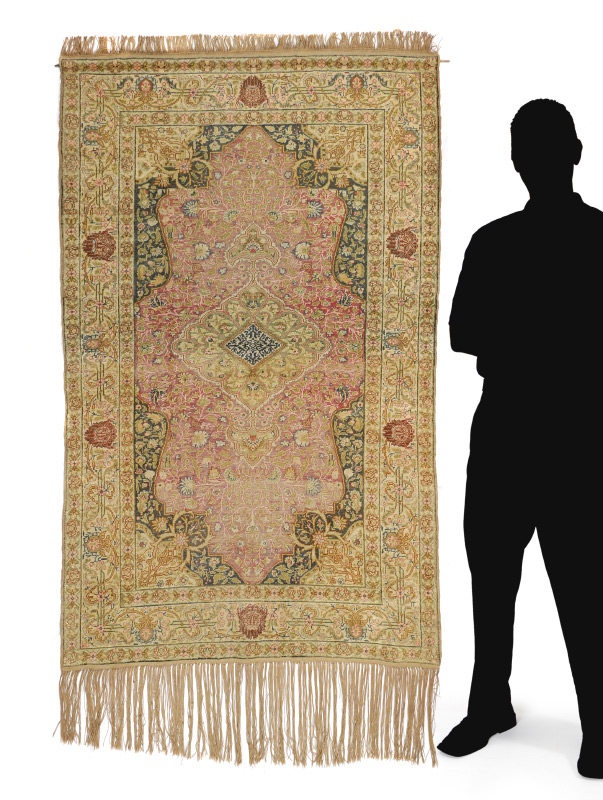 SEMI-ANTIQUE TURKISH KAYSERI HAND KNOTTED SILK RUG, 4'2'' x 5'7'': This rug has a beautiful classical overall design like those given as gifts by royalty in olden days. The pale golden yellow ground central medallion has spandrels at either end and a center diamond shaped small white medallion with a dark blue line design. The central pale pinkish red field is outlined by a blue and yellow panel that has a profusion of flowers of various sizes just like those on the main field. The corners and borders of the rug are a pale golden yellow. The main border has an almost nouveau design with curving vines linking pale red ''faces'' palmettes and blue flowers. There is an extremely long fringe at one end and the other has been cropped. This rug has been hung through part of its life, pocket still in place on back.