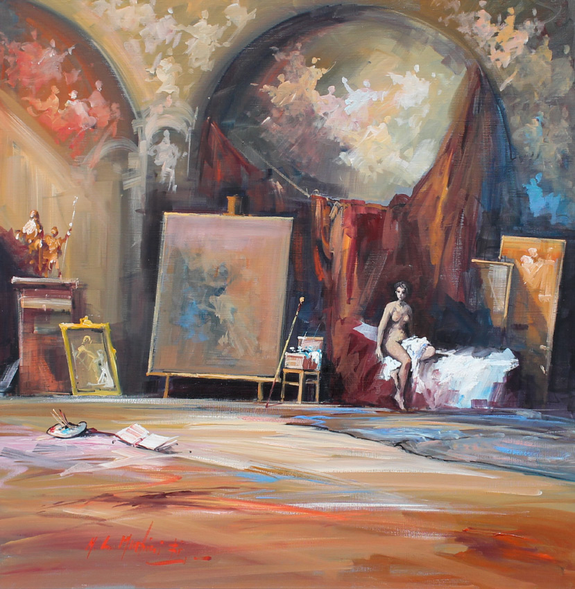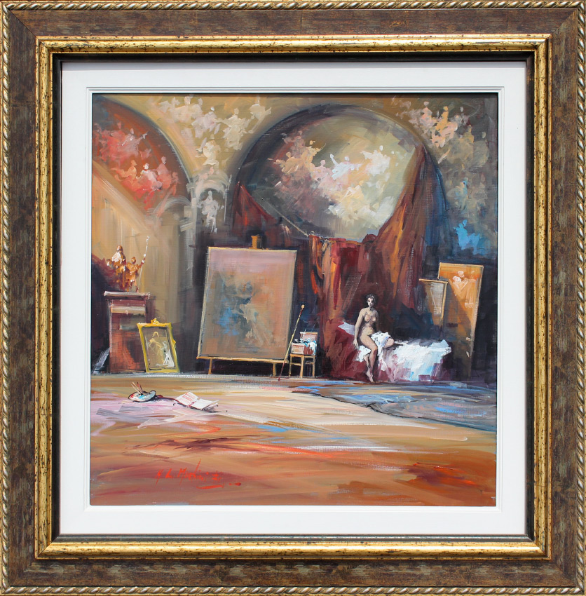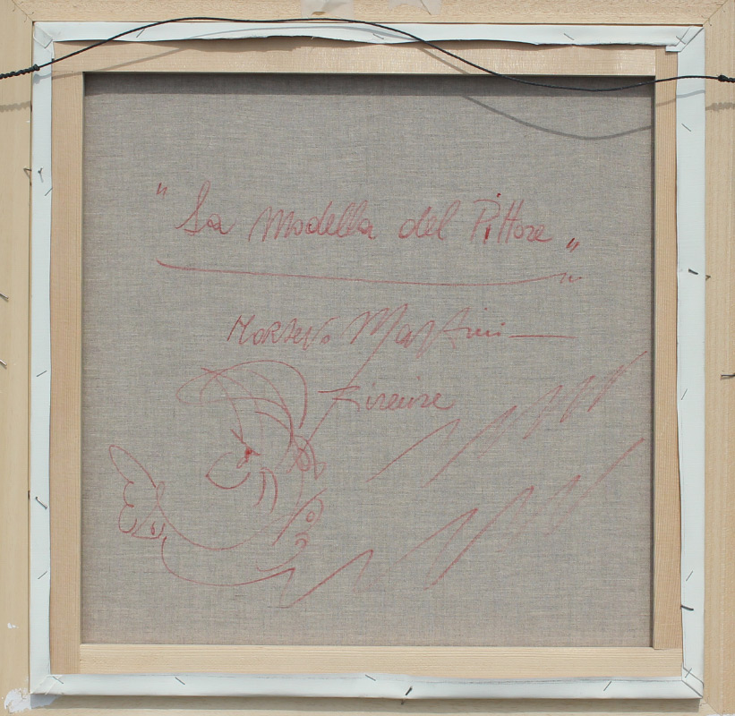 MARTINI, Norberto, (Italian, 1940-2007): ''Sa Modela Pittore'', Oil/Canvas, 23.5'' x 23.5'', signed lower left, signed and titled verso with artist's remarque, custom frame, 33.5 x 33.75''. Former Collection of Medici Gallery Sarasota Florida.